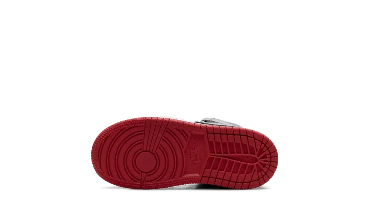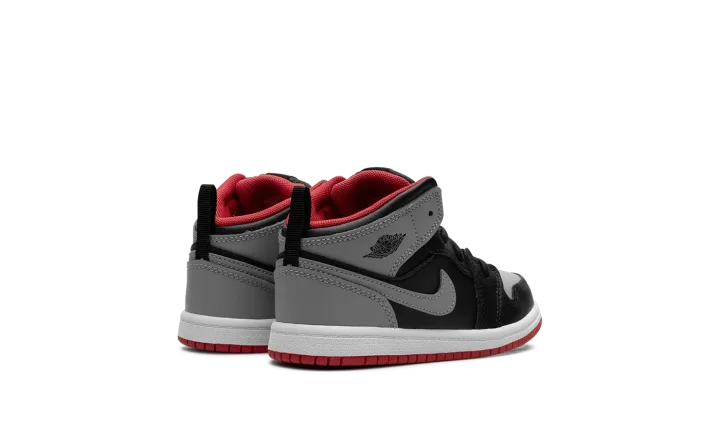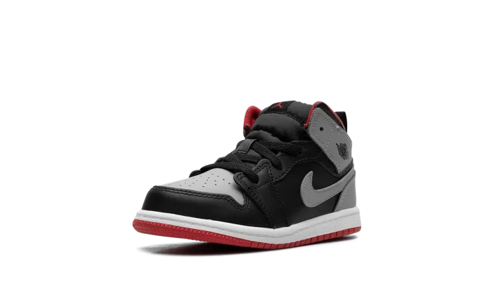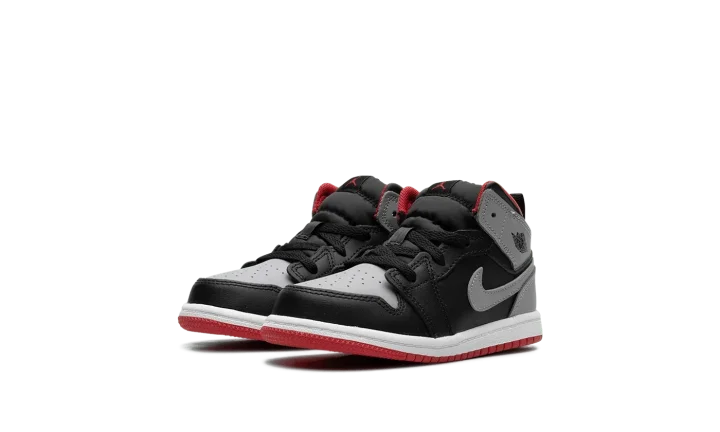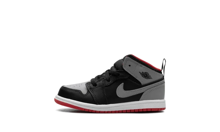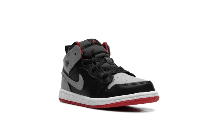 The Air Jordan 1 Mid TD "Black/Cement Grey" is the toddler sizing of the lifestyle shoe with a neutral-colored look. The "Black/Cement Grey" Jordan 1 Mid TD features a Cement Grey leather on the perforated toe, collar, and heel, and black leather on the toe cap, forefoot, eyelets, and mid-panel. A Cement Grey leather Swoosh appears on both sides, and a "Wings" logo is found on the collar. A Fire Red Jumpman is located on the tongue tag, while a pull tab on the heel assists with on/off wearability.