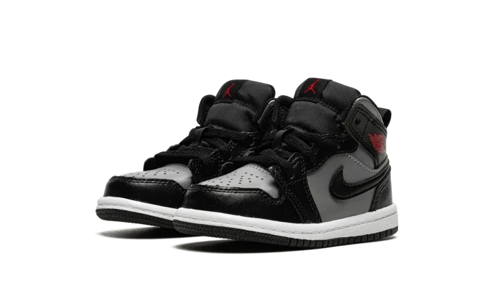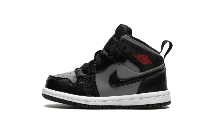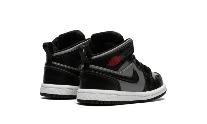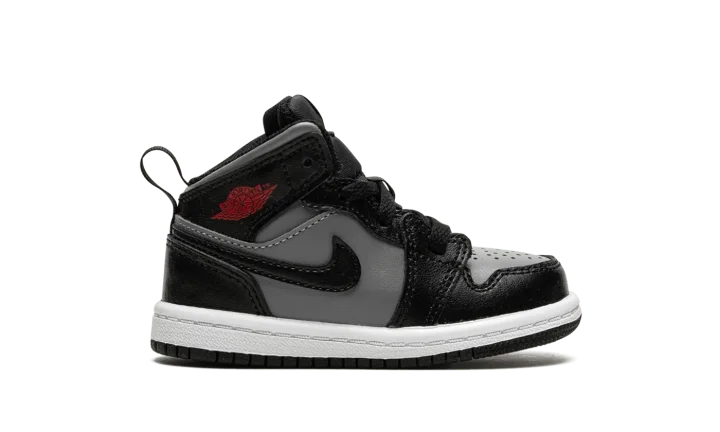 The Jordan 1 Mid TD "Shadow/Red" is the toddler sizing of Michael Jordan's first signature shoe in a mostly two-tone, black-and-grey colorway. The casual look for the Jordan 1 Mid is based on the original "Shadow" colorway from 1985, though there are several differences between the retro shoe and the modern "Shadow/Red" style. The latter features a Particle Grey leather base with contrasting black leather overlays and Swoosh branding. A Gym Red "Wings" logo is found on the collar. A fiery red Jumpman is located on the black nylon tongue tag on the black nylon tongue. A pull loop on the heel assists with on-off wearability.