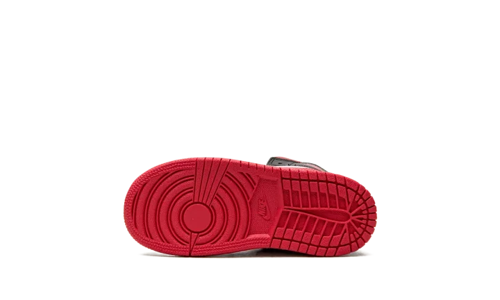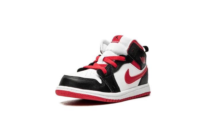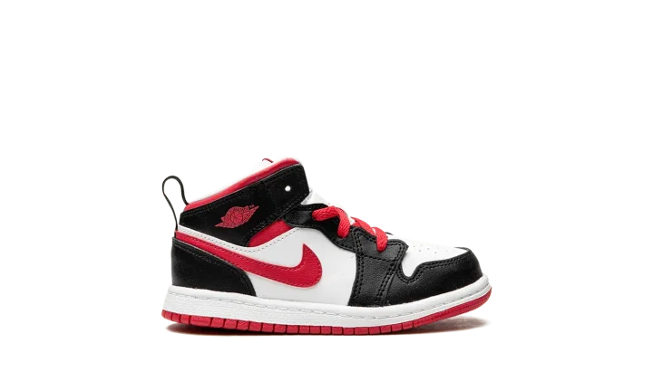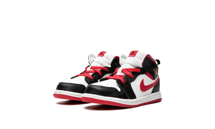 The Jordan 1 Mid TD "Very Berry" is the toddler sizing of the mid-top lifestyle shoe in a colorway that loosely pays homage to the Chicago Bulls, Michael Jordan's former basketball team. The "Very Berry" Jordan 1 Mid TD features a white leather upper with contrasting black leather overlays on the toe, forefoot, eyelets, collar, and heel. A Very Berry shade of red is found on the side Swooshes. The collar overlays features a "Wings" logo in red. Additional branding appears on the red nylon tongue tag with a black Jumpman logo. A white midsole and red rubber outsole complete the look.