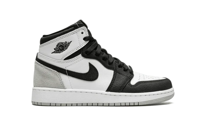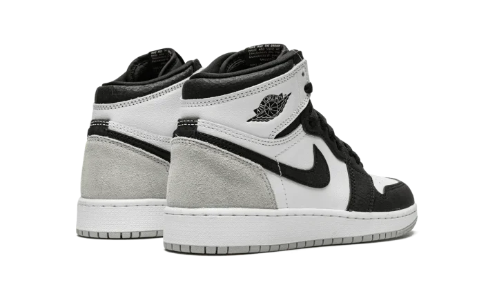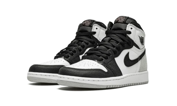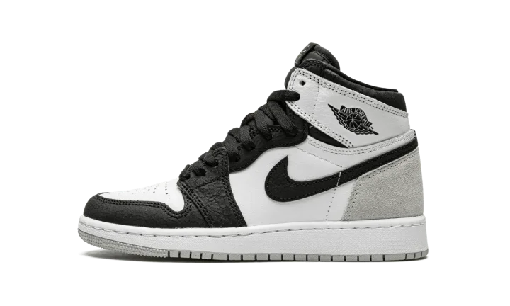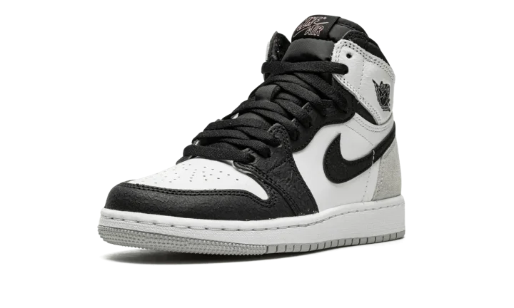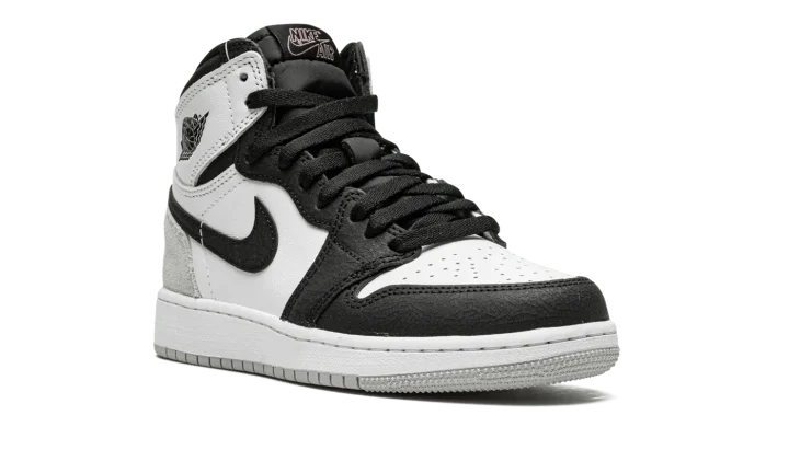 The Air Jordan 1 High OG GS "Stage Haze" is the youth sizing for the neutral based colorway of Michael Jordan's first signature shoe. The "Stage Haze" is a versatile makeup of the vintage basketball shoe that was released as part of Jordan Brand's Spring and Summer 2022 collection. Its design is complete with a white leather base with a black leather Swoosh on either side. Black textured leather appears on the toe cap, forefoot, eyelets, and collar. The heel panel features a plush light grey suede material. A black "Wings" logo is found on the collar. Additional branding comes into play on the tongue tag with a pink outline "Nike Air" logo. Release date: June 8, 2022