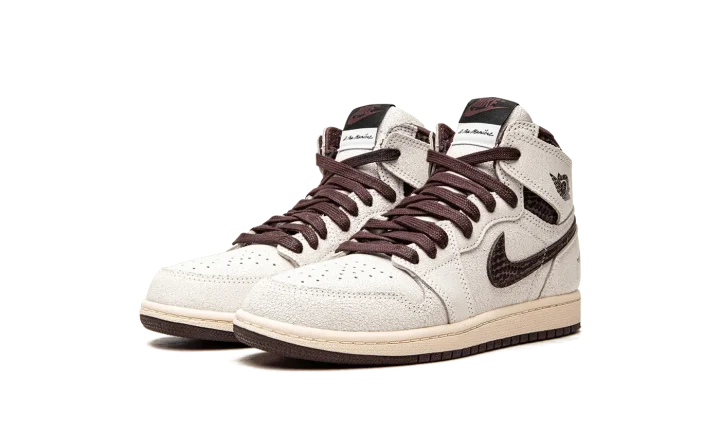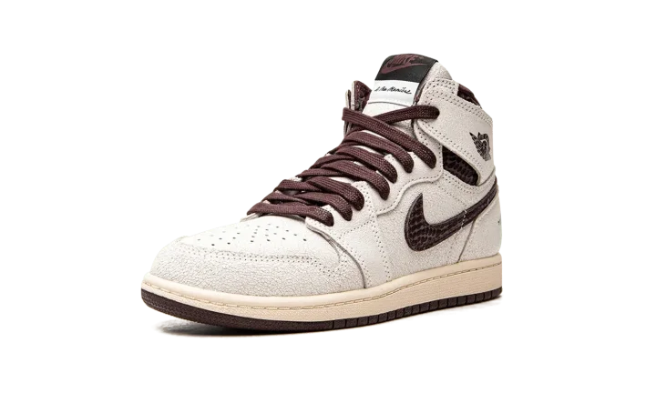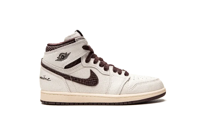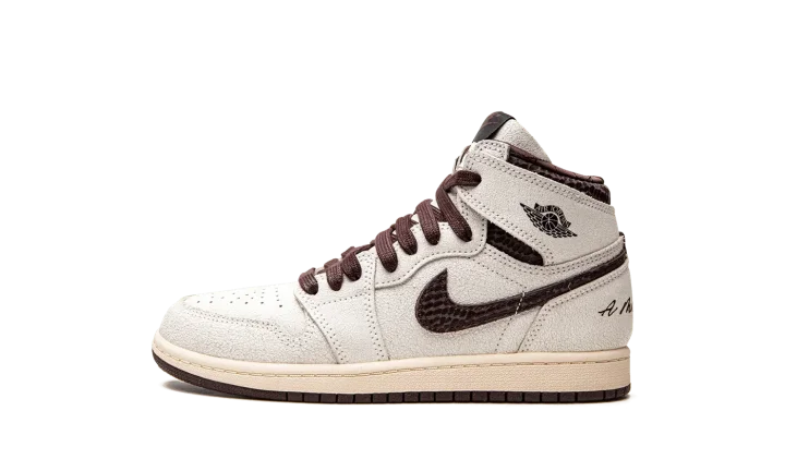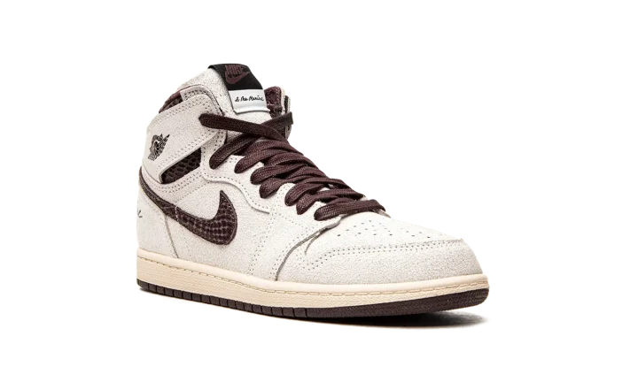 The A Ma Mainére x Air Jordan 1 High OG is the preschool version of the collaboration between the upscale fashion boutique and Jordan Brand on Michael Jordan's retro basketball shoe that was released in December 2021. Like A Ma Mainére's Women's Air Jordan 3 "Raised by Women" collaboration, one of the top sneaker releases of 2021, the boutique's take on Jordan's first signature shoe is awash with luxury-inspired details, including a cracked white leather upper paired with a burgundy quilted interior lining. A burgundy snakeskin-covered Swoosh appears on either side of the shoe and a "Wings" logo is found on the collar. Dual "Nike Air" and "A Ma Mainére" detailing appears on the top of the cracked leather tongue with burgundy laces. Subtle design modifications by A Ma Mainére to the Air Jordan 1 include the phrase "You have to expect things for yourself before you can do them" on the inside of the flaps, and "Airness by A Ma Mainére for Air Jordan" branding on the insole. A cream rubber midsole and burgundy outsole complete the look. Release date: December 3, 2021