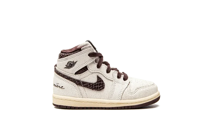 The A Ma Maniére x Air Jordan 1 High OG TD is the toddler sizing of the limited edition collaboration between James Whitner's clothing boutique and Jordan Brand on Michael Jordan's retro basketball shoe. The boutique's take on Jordan's first signature shoe is awash with luxury-inspired details, including a cracked white leather upper paired with a burgundy quilted interior lining. A burgundy snakeskin-covered Swoosh appears on either side of the shoe and a "Wings" logo is found on the collar. Dual "Nike Air" and "A Ma Maniére" detailing appears on the top of the cracked leather tongue with burgundy laces. A cream rubber midsole and burgundy outsole complete luxurious the look. Release date: December 3, 2021