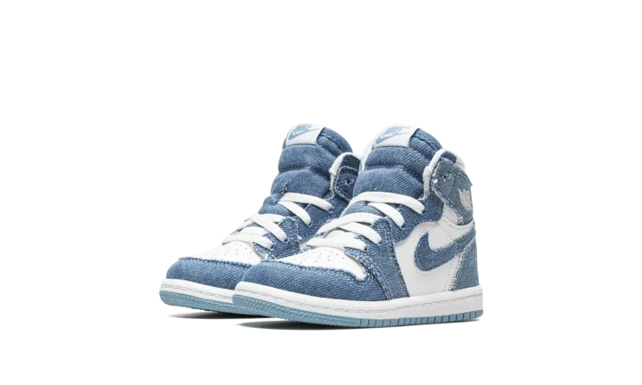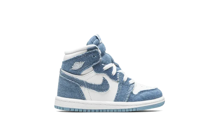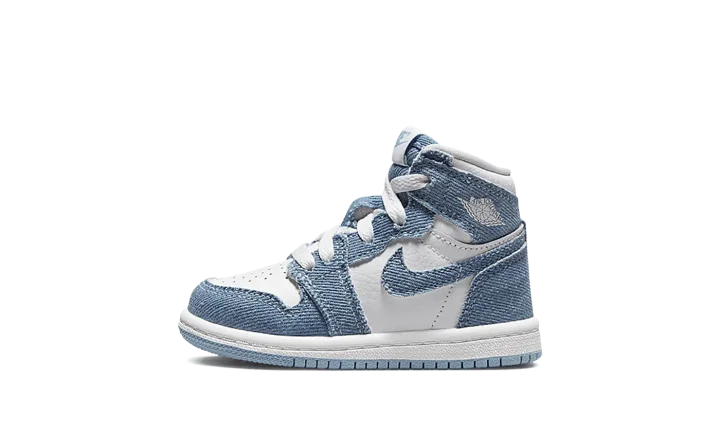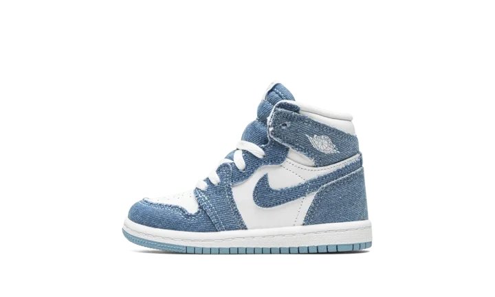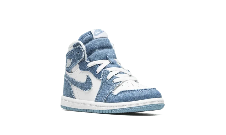 The Air Jordan 1 High OG TD "Denim" is the toddler sizing of Michael Jordan's first signature shoe in a denim-constructed colorway. The "Denim" makeup of the vintage basketball shoe features an eye-catching design with frayed denim overlays against a white leather base. The perforated toe, mid-panel, and collar appear in white leather while the overlays and Swoosh are designed in the aforementioned denim construction with rough edges.