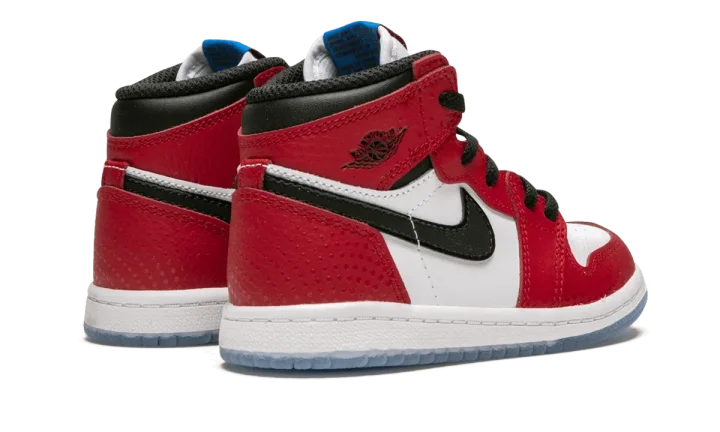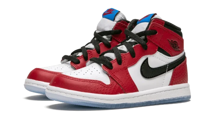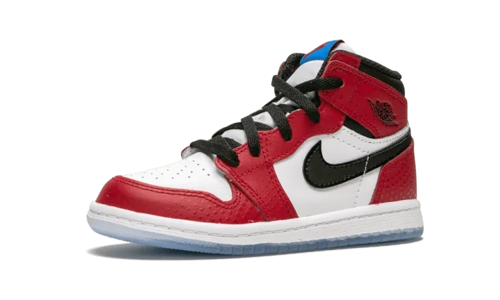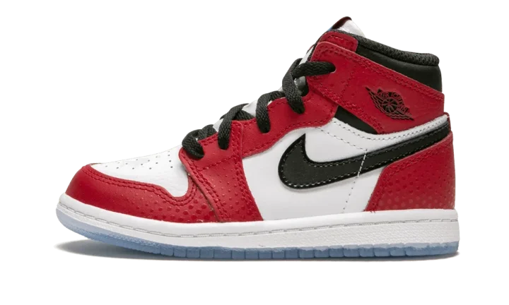 The Spider-Man x Jordan 1 High TD "Origin Story" is the toddler size of the Jordan 1 celebrating the release of the Marvel film "Spider-Man: Into the Spider-Verse" in 2018. The colorway starts with inspiration from the original "Chicago" colorway of the Air Jordan 1 that the character Miles Morales wears in the film, and then adds special Spider-Man themed details. The red leather paneling of the upper has a reflective dot print referencing Spider-Man's suit, while the Nike logo tongue tag comes in the superhero's blue and red color scheme. An icy clear outsole completes the design. The limited edition Spider-Man x Air Jordan 1 High TD "Origin Story" for toddlers released on December 14, 2018 to coincide with the film's premier.