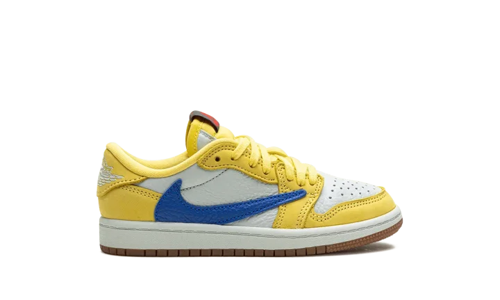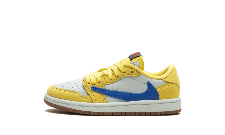 The Travis Scott x Air Jordan 1 Low OG PS "Canary" is the preschool sizing version of the retro basketball shoe inspired by the hip-hop star's high school. Also known as the "Elkins" after Scott's high school, the "Canary" Jordan 1 Low OG features bold, creative details such as the rapper's signature reverse Swoosh and "Cactus Jack" branding. Specifically, the upper has a white leather base with Canary leather overlays on the forefoot and heel. A reverse Racer Blue leather Swoosh can be found on the lateral side and a standard blue leather Swoosh appears on the medial side. Scott's "smiley face" logo is embroidered on the left heel tab and a "Wings" logo is embroidered on the right heel tab. Classic red "Nike Air" branding appears on the black tongue tag. A gum rubber outsole completes the look. Release date: May 25, 2024