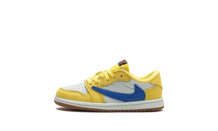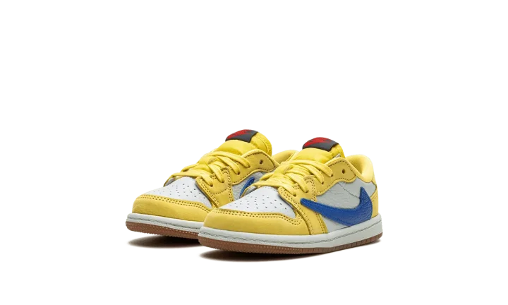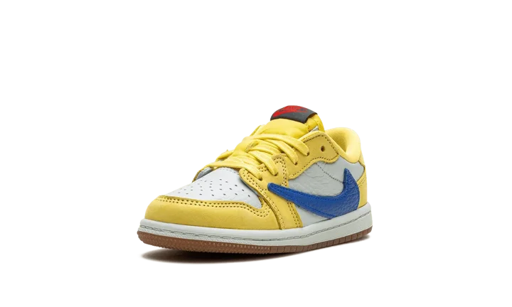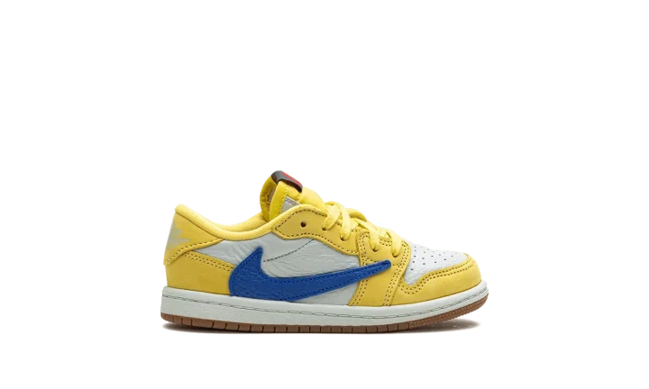 The Travis Scott x Air Jordan 1 Low OG TD "Canary" is the toddler sizing version of the retro basketball shoe inspired by the hip-hop star's high school. Also known as the "Elkins" after Scott's high school, the "Canary" Jordan 1 Low OG features bold, creative details such as the rapper's signature reverse Swoosh and "Cactus Jack" branding. Specifically, the upper has a white leather base with Canary leather overlays on the forefoot and heel. A reverse Racer Blue leather Swoosh can be found on the lateral side and a standard blue leather Swoosh appears on the medial side. Scott's "smiley face" logo is embroidered on the left heel tab and a "Wings" logo is embroidered on the right heel tab. Classic red "Nike Air" branding appears on the black tongue tag. A gum rubber outsole completes the look. Release date: May 25, 2024