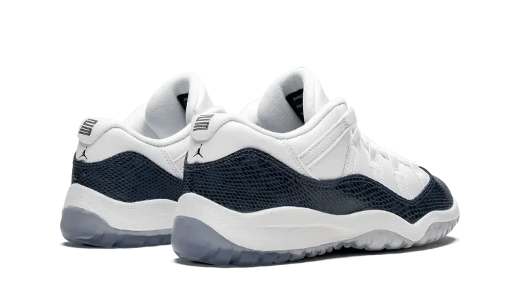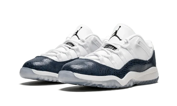 Striking the perfect balance between modern design and timeless construction, Jordan's athletic footwear always makes a bold statement. These white and navy 11 Retro Low LE sneakers are crafted from leather and feature a round toe, a flat rubber sole, a snakeskin effect, a lace-up front fastening and a logo patch at the tongue. These styles are supplied by a premium sneaker and street wear marketplace. Stocking only the most sought-after footwear and clothing, they source and curate some of the most hard-to-find items from around the world.