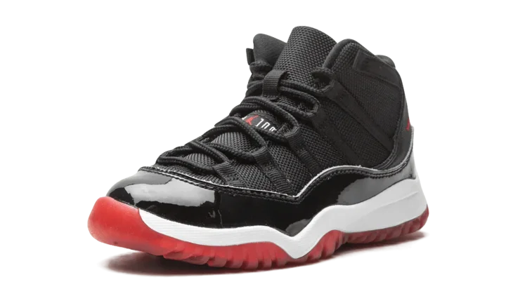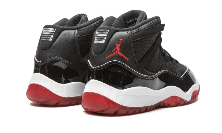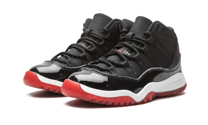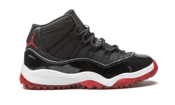 The Air Jordan 11 PS "Bred 2019" is the preschool sizing of the Winter 2019 release of Michael Jordan's iconic eleventh signature shoe. The legendary Air Jordan 11 "Bred" colorway is widely considered one of the greatest colorways of any Air Jordan model and without a doubt one of the most influential Tinker Hatfield-designed sneakers of the '90s. Opulent black patent leather, a signature design element of the Air Jordan 11, wraps around the entire upper while black mesh paneling is located near the eyelets. Tonal leather and an embroidered red Jumpman logo on the heel are true-to-original details of the Air Jordan 11. A nod to Jordan's jersey number "23" covers the heel and a white midsole with a semi-translucent outsole and carbon fiber trim complete this masterpiece. The Air Jordan 11 PS "Bred 2019" in preschool sizing was released on December 14, 2019.