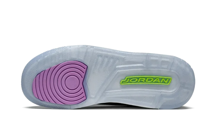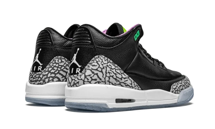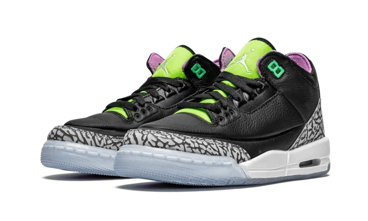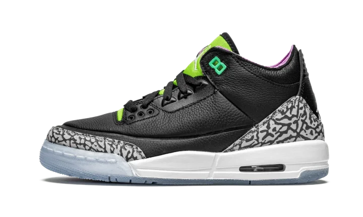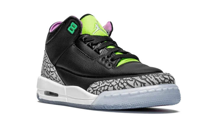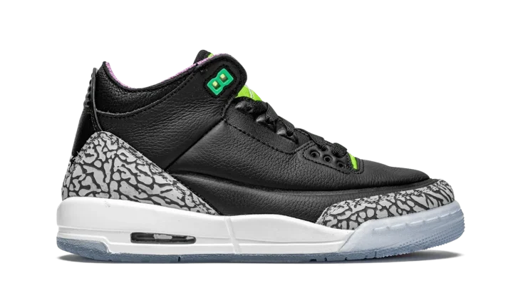 The Air Jordan 3 GS "Electric Green" is a youth exclusive colorway released in May 2021 of Michael Jordan's third signature shoe. A potent look that could easily hold its weight as an adult sizing option, the "Electric Green" combines neon-colored accents with a black tumbled leather upper. Jordan Brand embroidered a white Jumpman on the Electric Green tongue and dressed the inner collar in Violet Shock. The model's original elephant print appears on both the toe and the heel. A Jumpman logo can be found on the back of the shoe and a small visible Air unit appears in the heel of the white midsole. An icy blue translucent outsole completes the look. Release date: May 13, 2021.