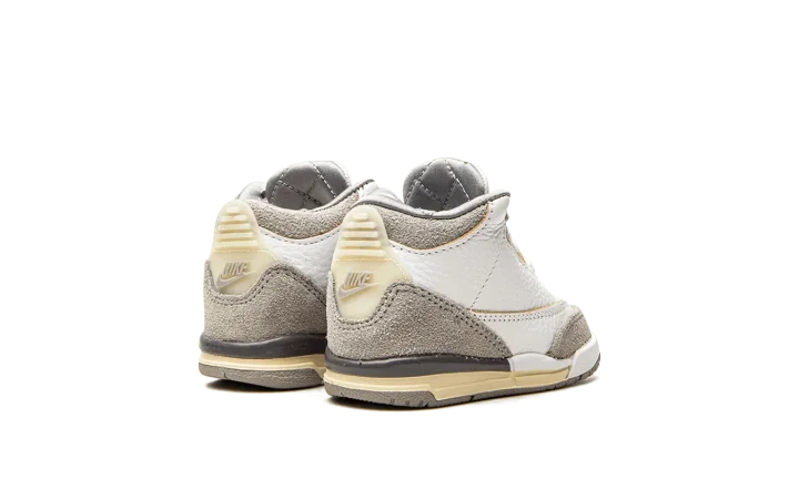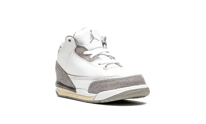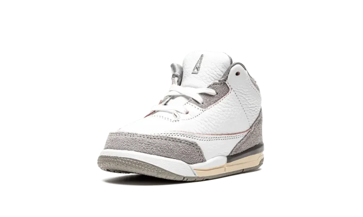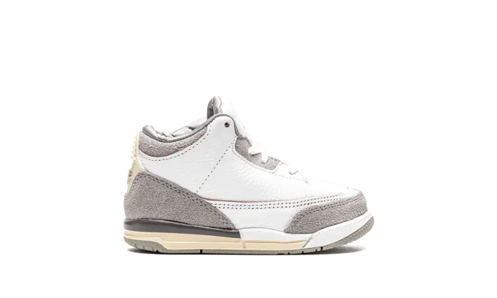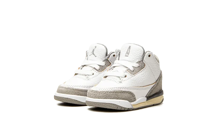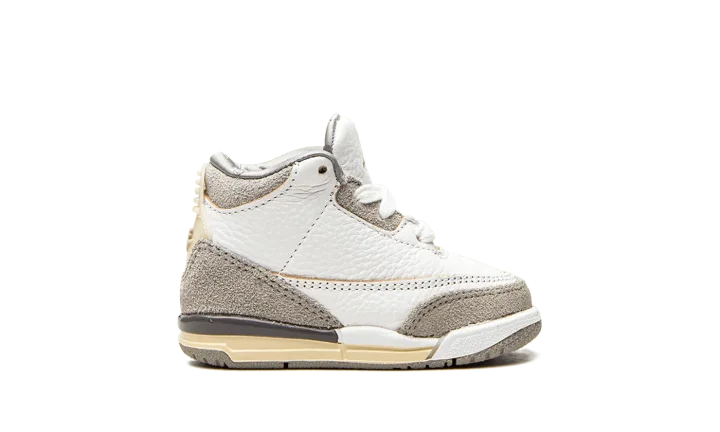The A Ma Maniere x Jordan 3 TD "Raised by Women" is the toddler sizing of the collaboration between the Atlanta based retailer and Jordan Brand on Michael Jordan's third signature shoe. A Summer 2021 release, the "Raised by Women" is A Ma Maniere's first collaboration with Jordan Brand following its popular "Hand Wash Cold" collection with Nike in 2019. Decidedly vintage-looking, the "Raised by Women" is an ode to A Ma Maniere owner James Whitner's relationship with his mother, specifically the first shoe she bought Whitner as a kid, which was the Jordan 3. The white tumbled leather upper is matched to a buttery grey suede material on the toe, eyelets, collar, and heel. Cream accenting on the lace holes and heel counter with the Jordan 3's original "Nike Air" branding mimic the look of design elements that have undergone the process of oxidation. The midsole is painted a shade of Violet Ore and dual A Ma Maniere and Jumpman insignia highlight the left and right tongues, respectively.