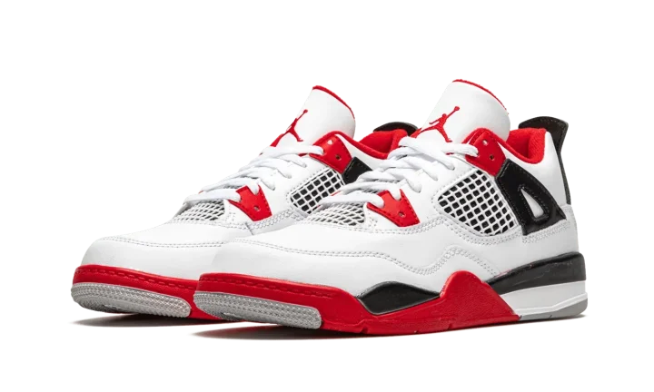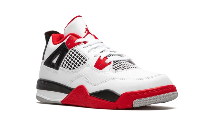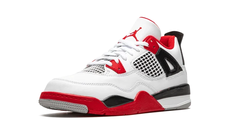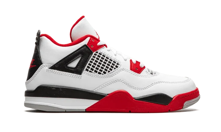 The Air Jordan 4 PS "Fire Red 2020" is the preschool youth sizing of one of the four original colorways of Michael Jordan's fourth signature shoe. A November 2020 release, the "Fire Red" seen here marks the first time the colorway has featured the iconic Nike branding on the back of the shoe since the original release in 1989. Keeping the shape and color scheme as close to the original as possible, the upper features white leather on the toe, collar, and heel. White netting is located on the throat and mid-panel. The eyelets, liner, and outsole feature Fire Red accenting per the "OG" look. Branding appears in the form of a red Jumpman on the tongue tag and the red "Nike Air" logo on the heel. Finishing touches include a back mudguard and white midsole with a clear Air window in the heel. Release date: November 28, 2020.