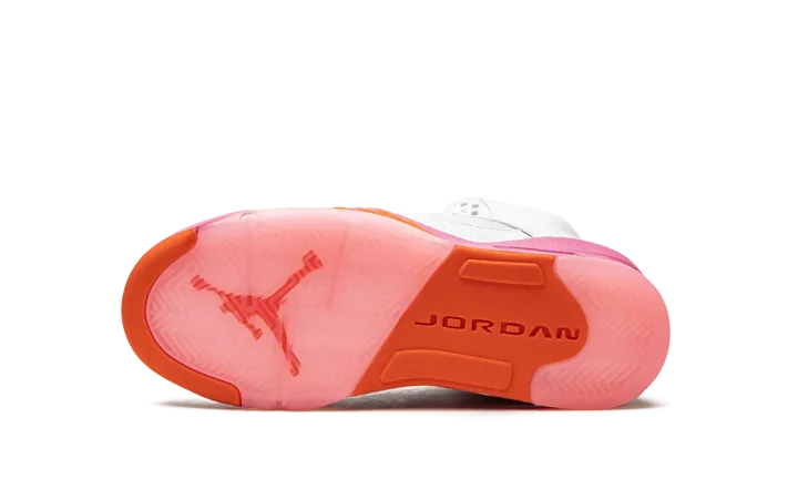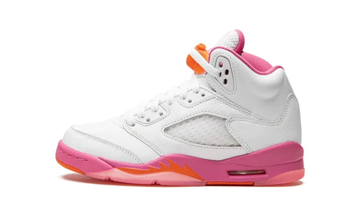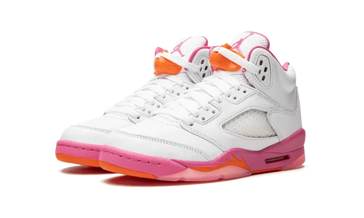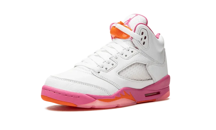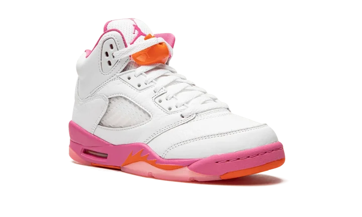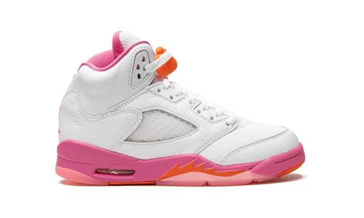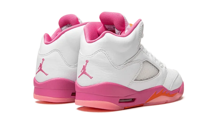 The Air Jordan 5 GS "Pinksicle" is the youth sizing of Michael Jordan's fifth signature shoe in a casual colorway with a spring and summer vibe. The "Pinksicle" brings a laidback look to the vintage basketball shoe. The shoe's upper is constructed in white leather. Translucent netting appears on the mid-panel and on the tongue. A Pinksicle-colored Jumpman is embroidered on the back of the shoe and on the tongue. An orange lace lock breaks up the design's neutral-based appearance. Orange shark tooth detailing appears on the pink midsole. Release date: July 1, 2022