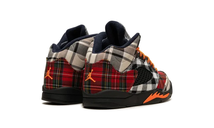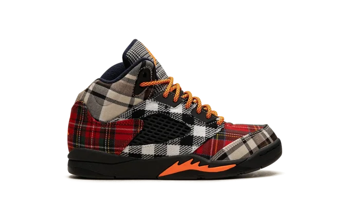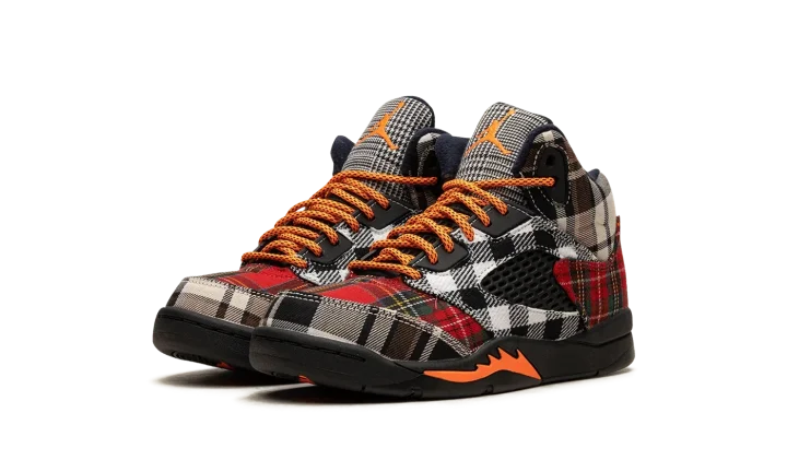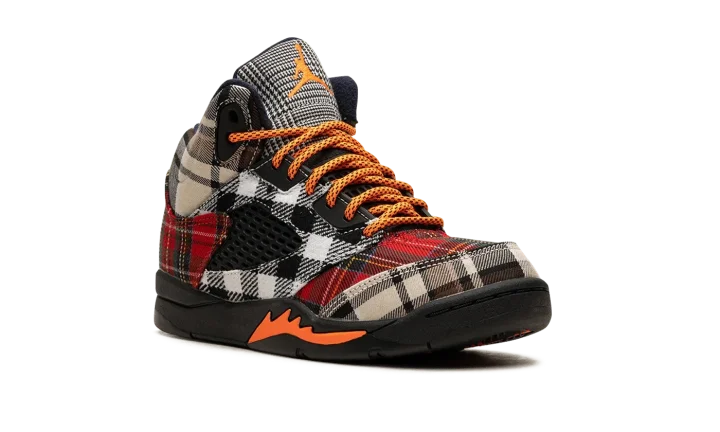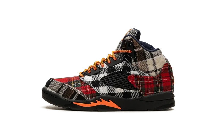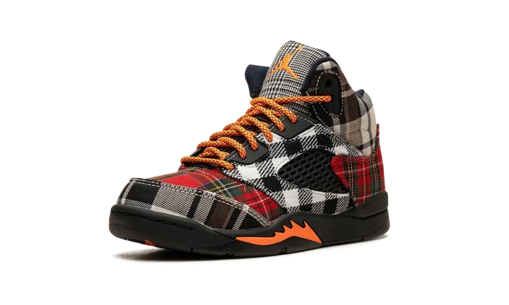 The Air Jordan 5 PS "Plaid" is the preschool sizing of Michael Jordan's fifth signature in a fun colorway with various plaid patterns on its design. This unique-looking Jordan 5 colorway features multiple plaids in different color patterns on its upper. As for the rest of the shoe, a black mesh netting is seen on either side and on the tongue. Total Orange-colored speckled rope laces and an orange Jumpman appear on the tongue. Additional orange accenting can be found on the Jordan 5's signature shark tooth detailing on the forefoot. Release date: October 20, 2023