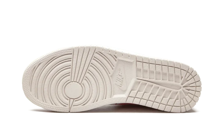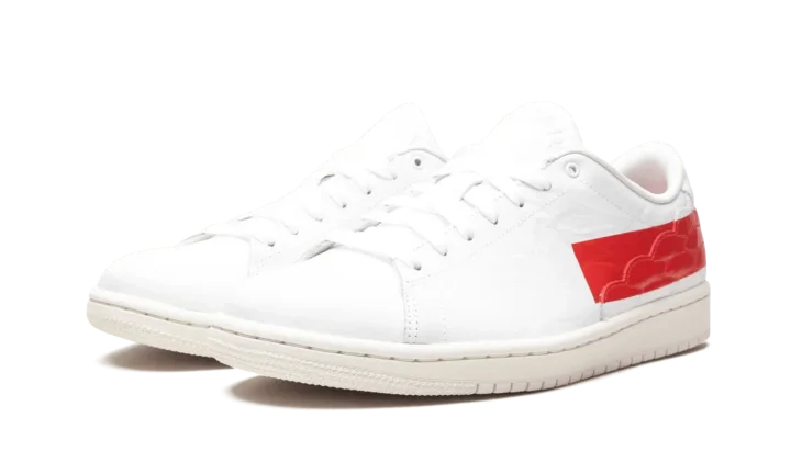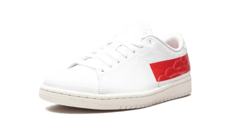 The Air Jordan 1 Centre Court "University Red" is an abstract-looking lifestyle version of Michael Jordan's first signature shoe that features a bold paint stripe on its design. Released by Jordan Brand in 2020 after seen on Michael's feet during segments in "The Last Dance" docuseries, the Jordan 1 Low Centre Court is an updated version of the basketball shoe that incorporates elements of classic tennis shoes and modern lifestyle footwear. White leather forms the base of the upper. An embroidered pattern mirroring the wings of the Air Jordan logo can be found on either side and on the back of the shoe beneath the red painted stripe on the heel. Embossed "Wings" and "Air Jordan" branding appear on the heel tab and tongue, respectively. Release date: April 8, 2021