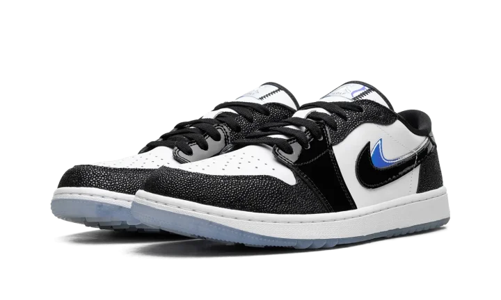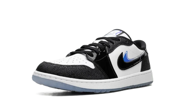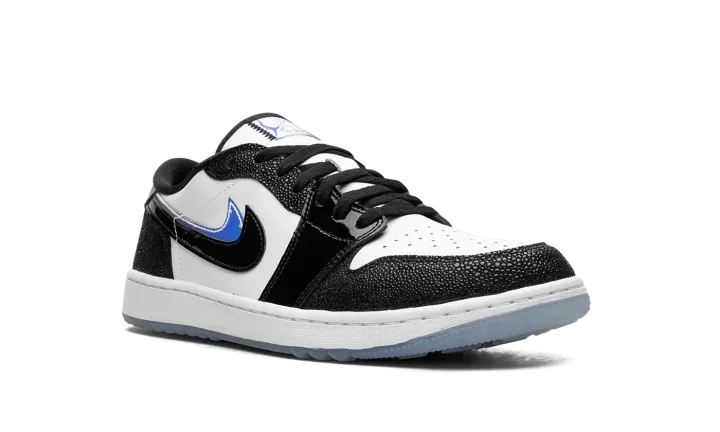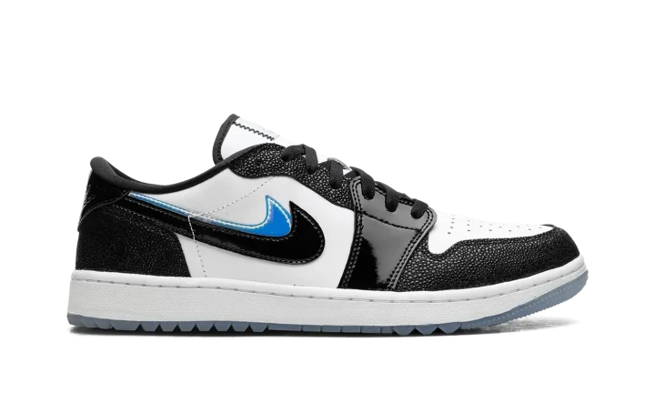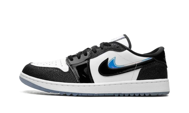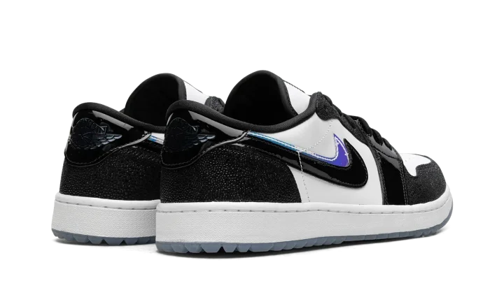 The Air Jordan 1 Low Golf "Endless Pursuit" is a colorway of the golf shoe with unique features. The Jordan 1 Low Golf is designed with modifications specifically tuned for golfing, including nubs on the outsole that provide traction on the fairway. The "Endless Pursuit" colorway is equipped with a white leather upper and black pebbled and patent leather overlays. A black patent leather Swoosh is layered over a smaller iridescent Swoosh on the sides. Additional iridescent detailing accents the tongue tag. "For the Endless Pursuit" is printed next to a Jumpman on the insole. A white rubber midsole and an icy blue translucent outsole finish off the look. Release date: April 12, 2024