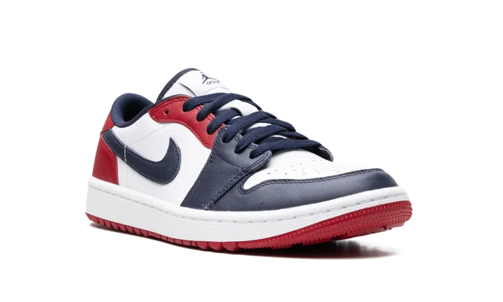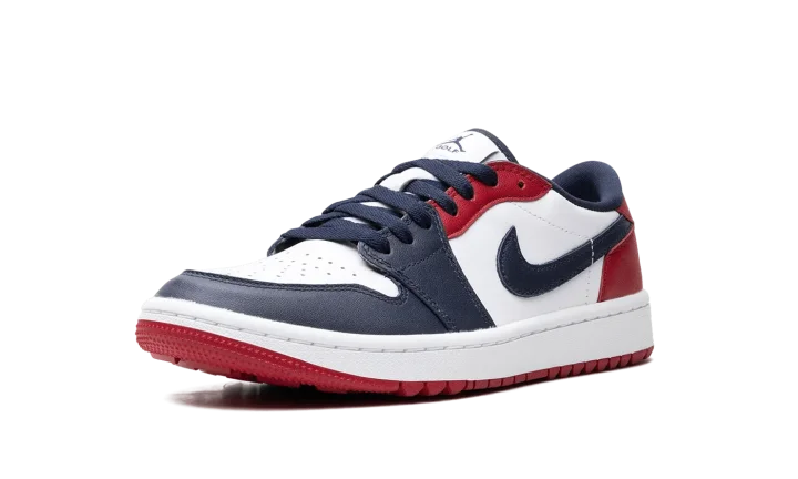 The Air Jordan 1 Low Golf "USA" is a patriotic colorway of the low-top golf shoe by Jordan Brand. Based on the Air Jordan 1 Low, the Jordan 1 Low Golf is essentially the same shoe as the former, but features nubs on the outsole for traction on a golf course. The "USA" colorway features a red, white, and blue color block, with white leather on the base, and Obsidian leather on the toe, forefoot, eyelets, and Swoosh. Varsity Red leather can be found on the middle eyelet panel and heel. A navy "Wings" logo appears on the heel, while Jumpman and "Golf" logos are seen on the tongue tag