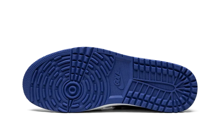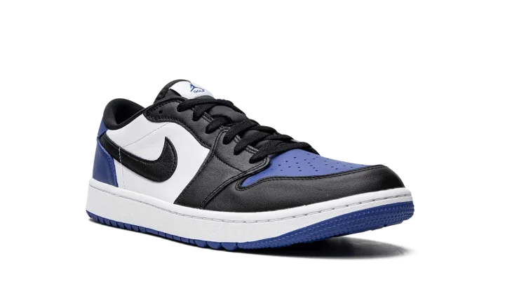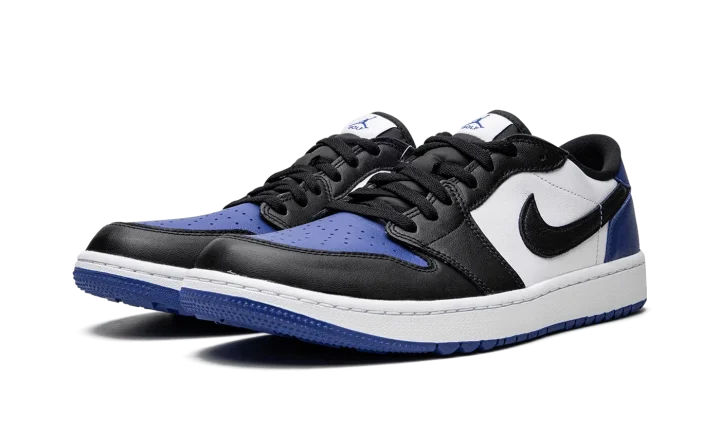 The Air Jordan 1 Low Golf "Royal Toe" is a modified version of the retro basketball shoe designed for golf in a colorway inspired by an original Jordan 1. The shoe in question is the Jordan 1's "Black Toe," which features a white leather toe and black forefoot. Here, the "Royal Toe" mimics the color block, but with Sport Royal leather on the toe and black leather on the forefoot. The mid-panel features white leather and the heel is designed in royal blue leather. A black leather Swoosh appears on the sides and a black "Wings" logo dots the heel. "Jordan Golf" branding is found on the tongue tag. Small nubs on the outsole provide traction on a golf course.