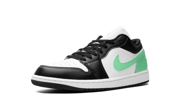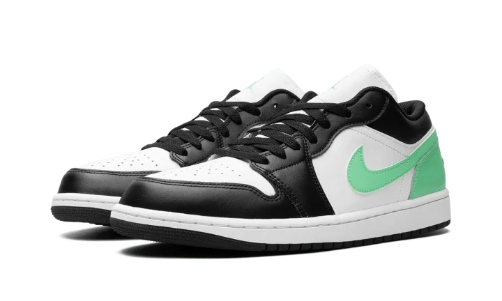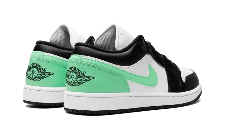 The Air Jordan 1 Low "Green Glow" is a colorway of Michael Jordan's first signature shoe in the low-top style with eye-catching green features. The colorway is complete with a white leather upper with a black leather toe cap, forefoot, and eyelets. A Green Glow leather Swoosh appears on the sides and Green Glow leather on the heel. More Green Glow accenting can be found on the Jumpman on the tongue. Underfoot, a white rubber midsole and black rubber outsole complete the look. Release date: March 20, 2024