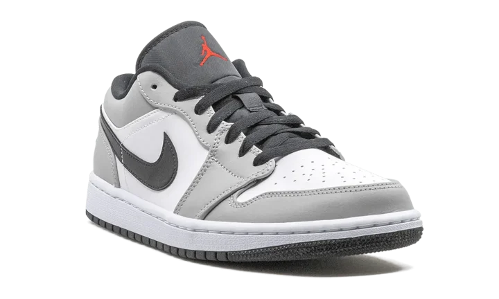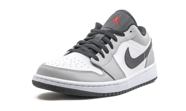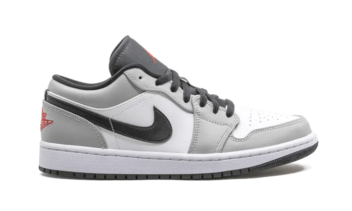 The Air Jordan 1 Low "Light Smoke Grey" features a neutral look that highlights the versatility of Michael Jordan's iconic first signature shoe in low-top form. The Jordan 1, one of streetwear's most popular sneakers of choice, adds a vintage flair to your collection with a timeless design. The same ethos underpins this "Light Smoke Grey" edition. Smooth white leather covers the perforated toe and mid-panel. Light Smoke Grey leather overlays on the forefoot, eyelets, collar, and heel add subtle contrasting to the appearance of the shoe. A black leather Swoosh dots the mid-panel and red embroidered "Wings" and Jumpman detailing appear on the heel and black nylon tongue, respectively. Release date: November 27, 2020.