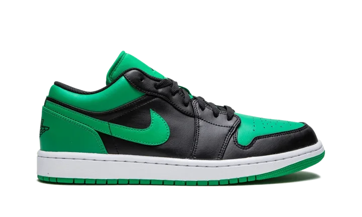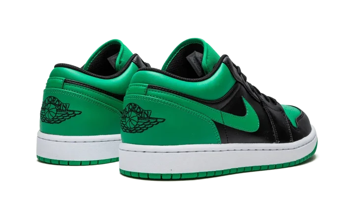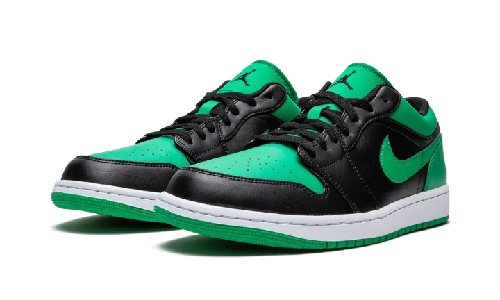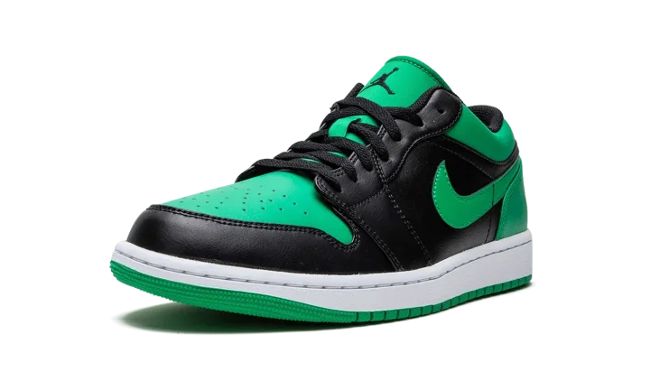 The Air Jordan 1 Low "Lucky Green" is a two-tone, black-and-green colorway of the popular sneaker from Jordan Brand's Spring 2023 collection. The "Lucky Green" Jordan 1 Low features a Lucky Green perforated leather on the toe and smooth green leather on the Swoosh and heel. Black leather is found on the overlays and on the mid-panel. A black "Wings" logo is embroidered on the heel and black Jumpman branding is stitched onto the green nylon tongue. Release date: April 11, 2023
