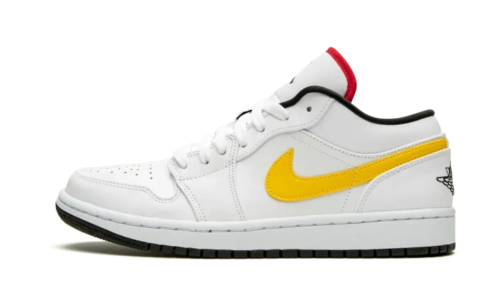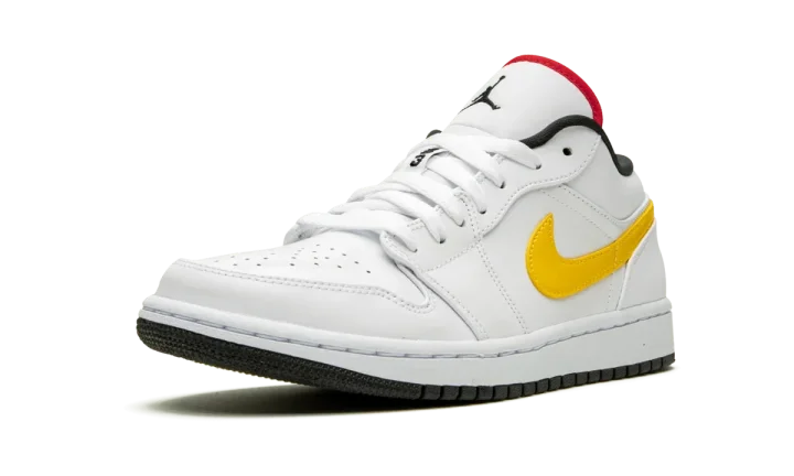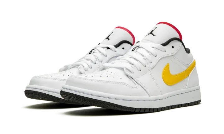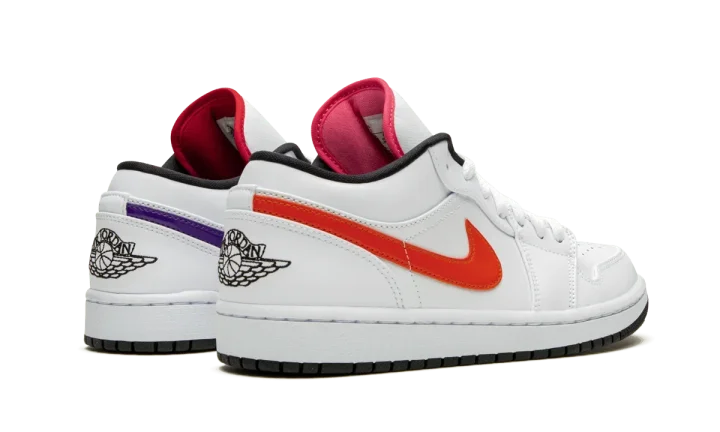 The Nike Air Jordan 1 Low offers a vibrant colorway that hit the shelves in early 2020. The upper features a white leather construction accented with the classic Air Jordan branding in black on the tongue and heel and a red and pink lining on each tongue. The multicolored Swooshes on each side are the main focus of this design as the left shoe is embellished with a yellow and purple Swoosh and the right includes touches of red and blue on the Nike insignias.