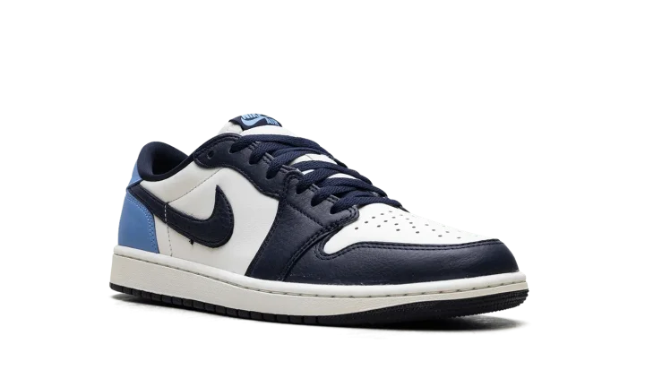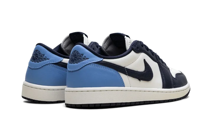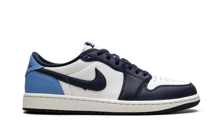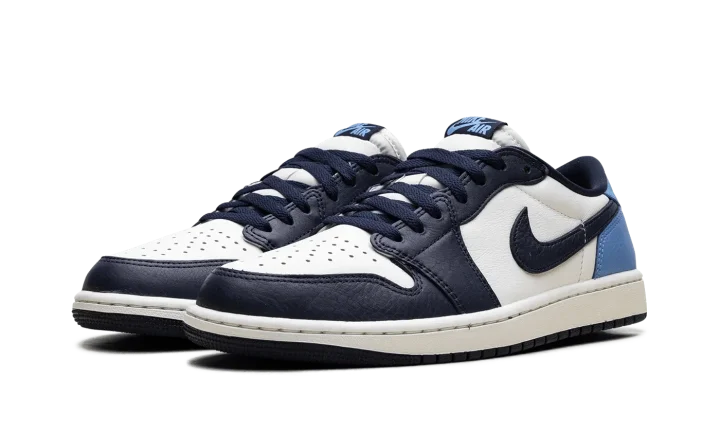 The Air Jordan 1 Low "Obisidian" is a 2025 lowtop colorway of Michael Jordan's first signature shoe. The AJ1 Low OG "Obisidian" has a leather upper that combines shades of navy and light blue with off-white. The lowtop Jordan 1 has a Wings logo on the heel and a navy Swoosh.
