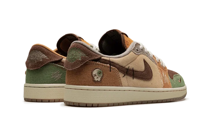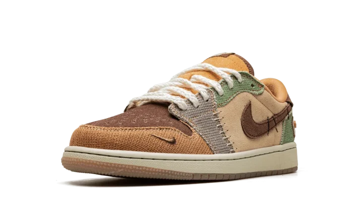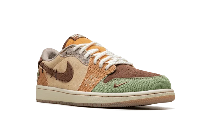 The Air Jordan 1 Low "Voodoo" is a special New Orleans-inspired colorway of the classic sneaker that was released alongside basketball star Zion Williamson's Nike Zion 2 of the same nickname. The "Voodoo" theme is undoubtedly inspired by voodoo dolls, a fixture of New Orleans' lore. A mismatched color block highlights the shoe's singular appearance. Specifically, beige-colored suede is found on the mid-panel and brown suede appears on the perforated toe. Burlap-like overlays are designed in a mismatched color block of green and brown on the toe, forefoot, eyelets, and heel of the left and right shoe. Brown stitching complements the tonal Swoosh on both sides of the shoe. Inverted mini Swooshes appear on the forefoot. An upside down "Wings" logo on the heel completes the look. Release date: November 8, 2022