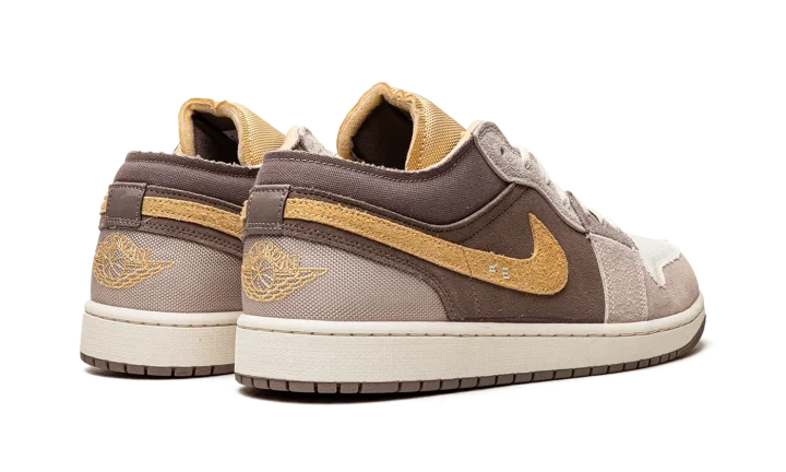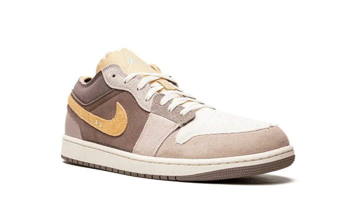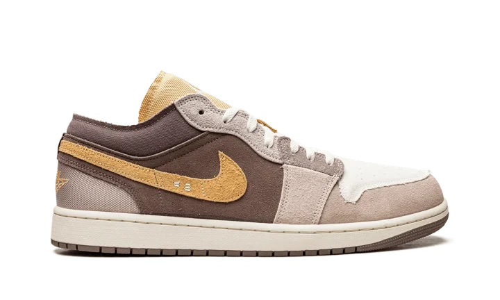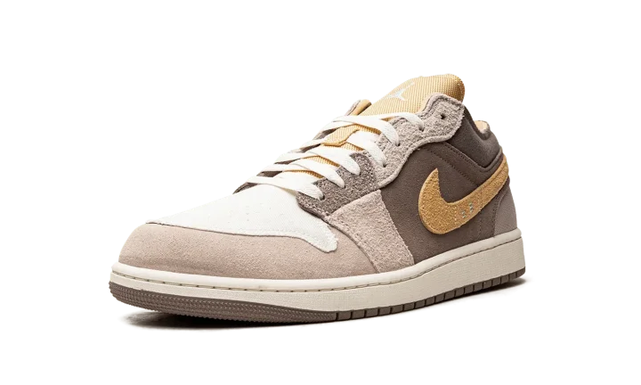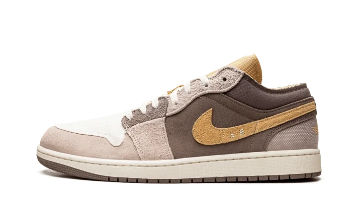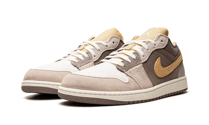 The Air Jordan 1 Low SE Craft "Taupe Haze" is a unique colorway of the alternate version of the classic low-top sneaker that modifies its design with a lifestyle-oriented twist. The Jordan 1 Low SE Craft gives the retro basketball shoe a modern spin by updating its design with suede and mesh panels in neutral tones. A gold suede Swoosh can be found on either side of the shoe and gold "Wings" branding is embroidered on the tan ballistic mesh heel. The gold mesh tongue is complete with a white embroidered Jumpman. Overall, the Jordan 1 Low SE Craft "Taupe Haze" features an "inside-out" design concept.