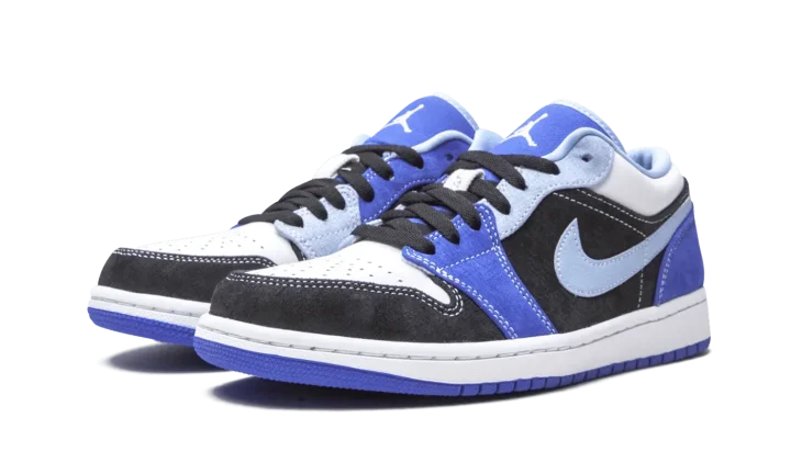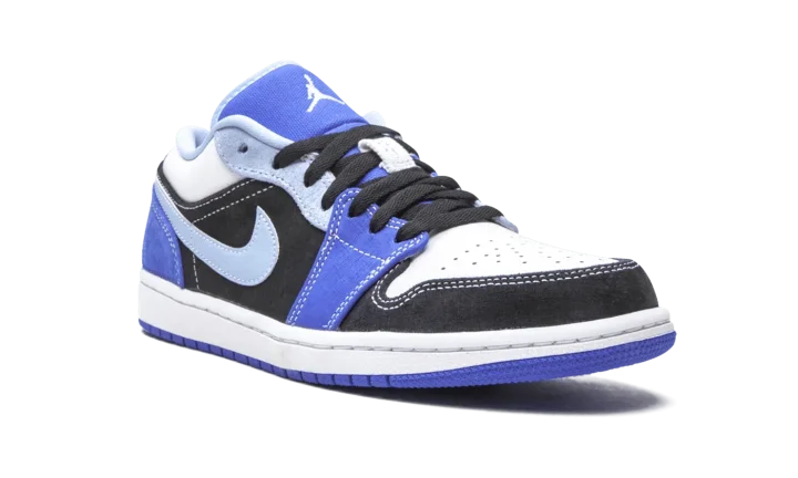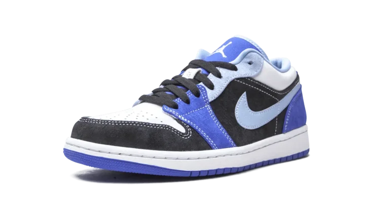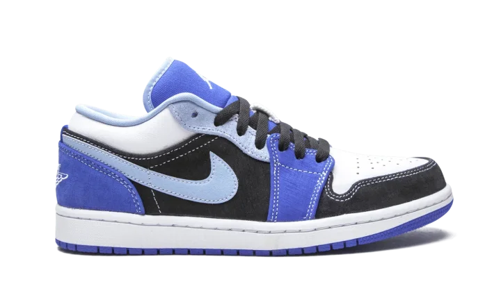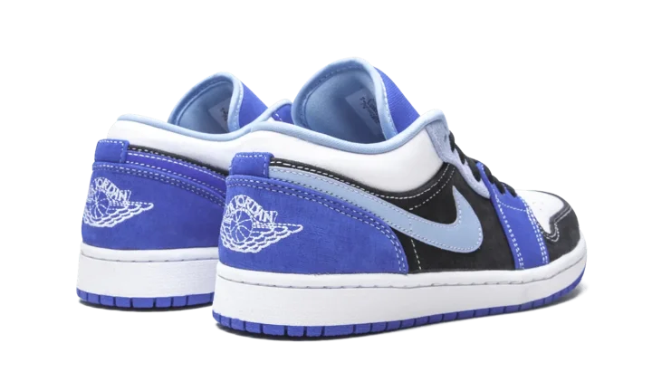 The Air Jordan 1 Low SE "Racer Blue" is one of the more unique colorways of the low-top version of Michael Jordan's first signature shoe. The "Racer Blue" theme was used on the Air Jordan 9 of the same nickname from January 2020, though in a more subtle manner when compared to the bespoke-style, patchwork design of the shoe seen here. Racer Blue suede appears on the forefoot and heel. The deep royal blue hue can be found on the canvas tongue, as well. A dusty University Blue suede Swoosh and upper eyelet panel contrast the black suede mid-panel and toe cap. Embroidered "Wings" and Jumpman branding can be found on the heel and the tongue, respectively. A white canvas overlay with "23" embroidery contrasts the black shoe laces. Jordan Brand finishes off the design with a white midsole and Racer Blue outsole.