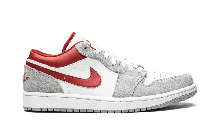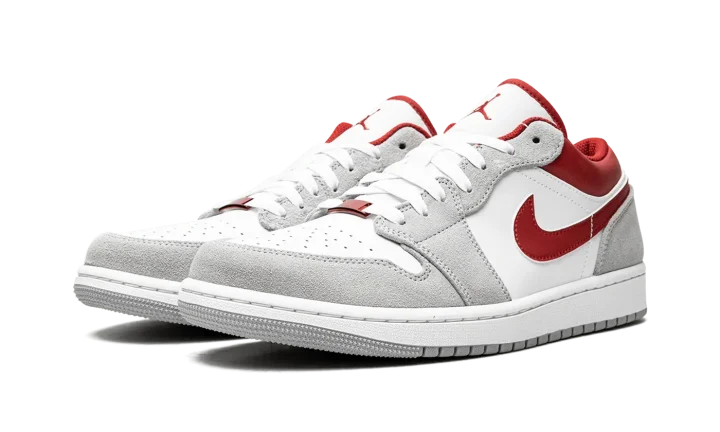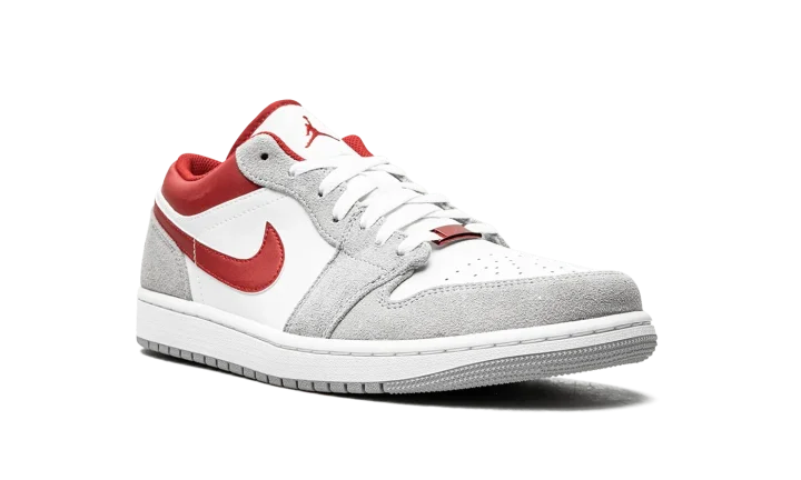 The Air Jordan 1 Low SE "White/Grey/Red" is another clean and wearable look for the versatile silhouette. The "White/Grey/Red" variation is complete with white leather on the perforated toe and mid-panel and Light Smoke Grey suede on the overlays and heel. An eye-grabbing Gym Red-colored leather Swoosh appears on either side and a red "Wings" logo is embroidered on the heel. Additional Gym Red accenting can be found on the collar, on the underside of the tongue, and on the Jumpman detailing that appears on the white nylon tongue. A semi-translucent red lace dubrae contrasts the look of the white laces. Underfoot, a two-tone, white midsole and Light Smoke Grey rubber outsole completes the look.