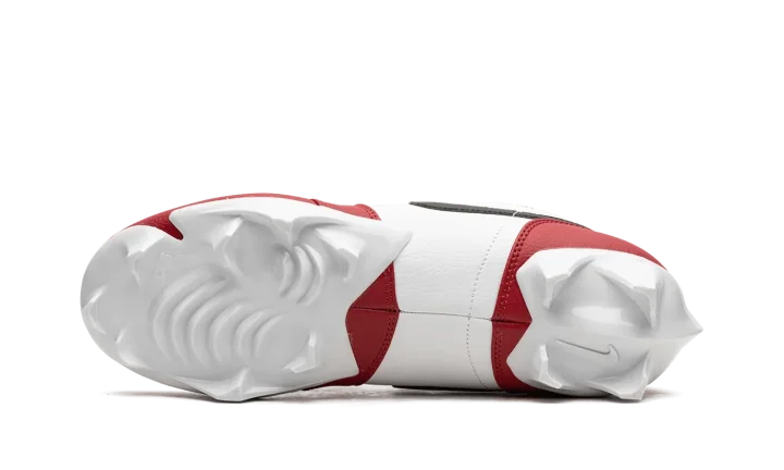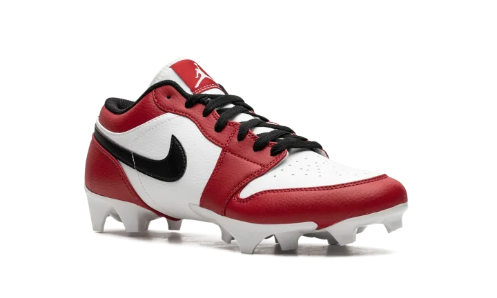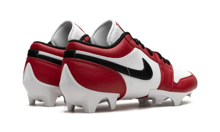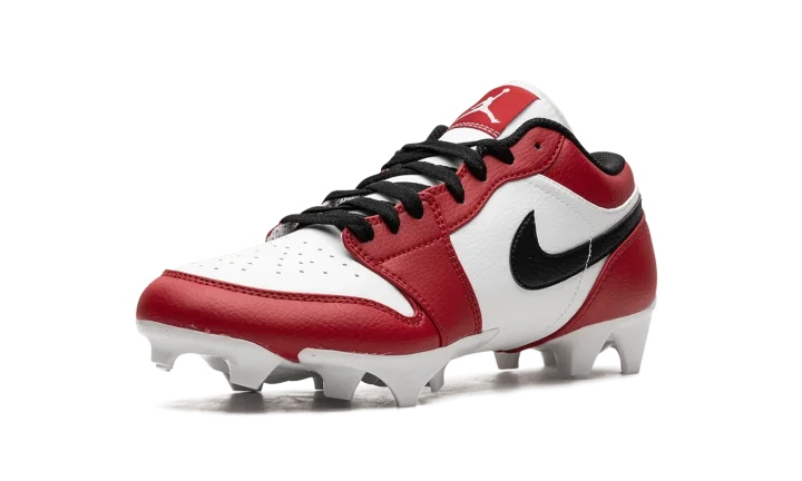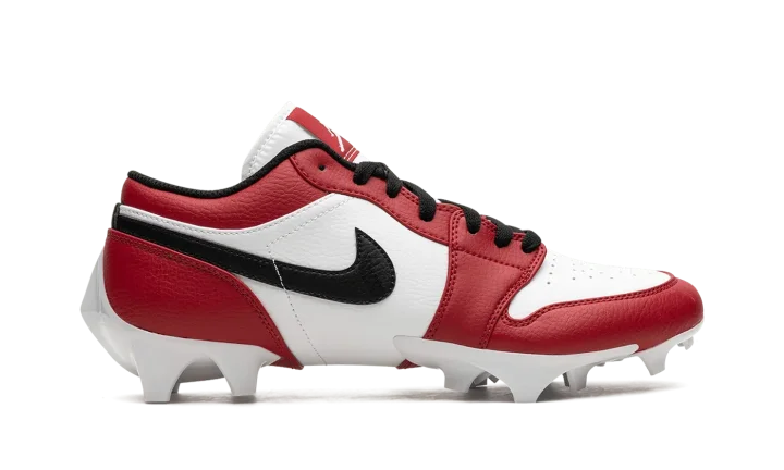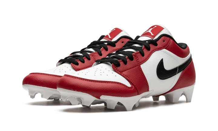 The Air Jordan 1 Mid Football Cleat Low "Chicago" is a version of the popular sneaker made for the football field. The Jordan 1 Mid Football Cleat features a cleat-style outsole that provides traction on grass or artificial turf. As for the rest of the design, the "Chicago" is inspired by the original Jordan 1 colorway that was worn by Michael Jordan with the Chicago Bulls back in the day. The shoe features a white leather construction with Varsity Red leather overlays and a black leather Swoosh. A white Jumpman appears on the tongue.