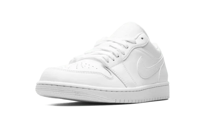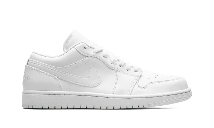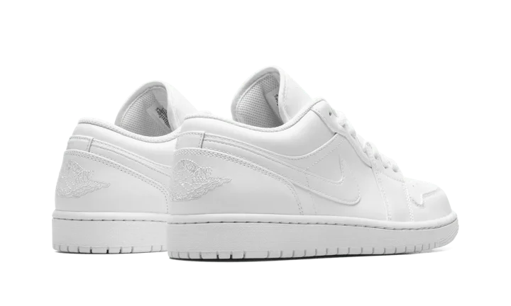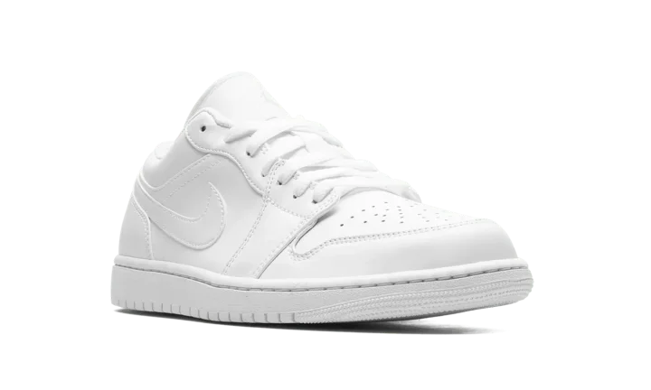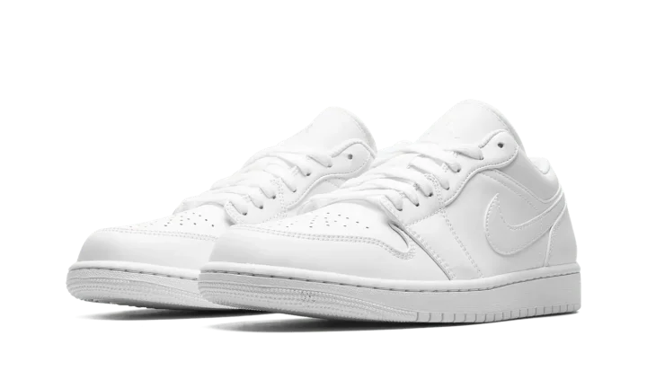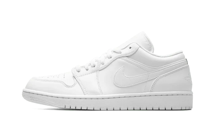 The Air Jordan 1 Low "Triple White" is a crisp, monochromatic white colorway of the classic low-top sneaker. The design features a white leather construction with tonal leather overlays and Swoosh branding on the sides. A white embroidered "Wings" logo is found on the heel and a white Jumpman is stitched on the tonal leather tongue. A white rubber sole completes the all-white-everything look. Release date: September 1, 2022