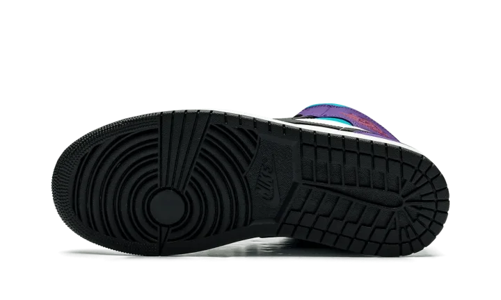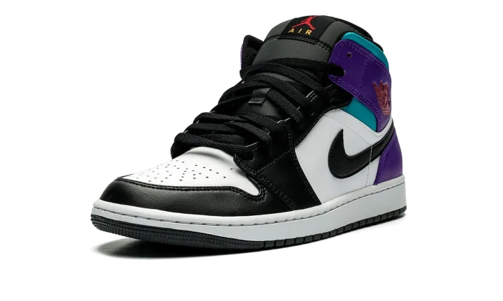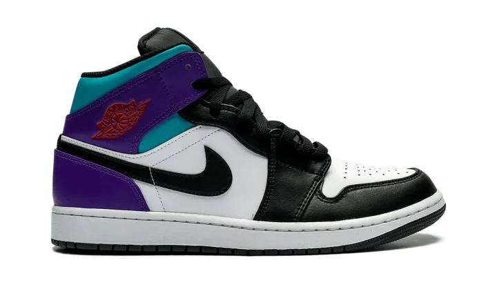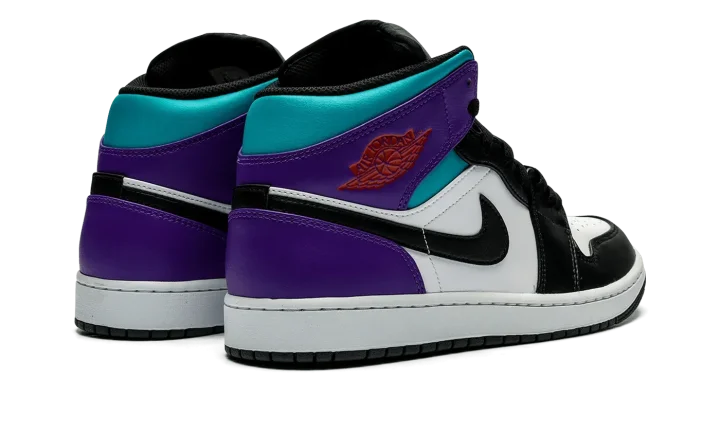 The Air Jordan 1 Mid "Aqua" is a colorway of the casual shoe with a '90s-inspired color scheme. In no way associated with the Charlotte Hornets, the "Aqua" Jordan 1 Mid nonetheless features the basketball team's uniform colors from the '90s on its design, which gives the shoe a decidedly retro flair. The upper has white leather on the perforated toe and mid-panel, and Court Purple leather on the collar and heel. The collar underlay is designed in an Aqua hue, while the Swoosh appears in black leather. A red "Wings" logo is seen on the collar, and red Jumpman and orange "Air" detailing appear on the tongue tag. Underfoot, a white rubber midsole and black rubber outsole complete the look.