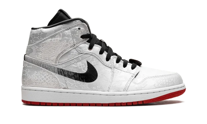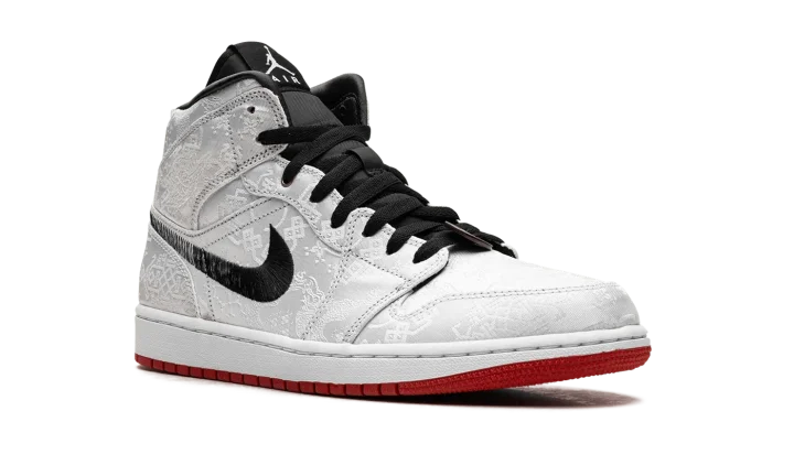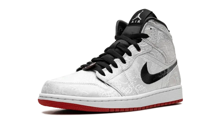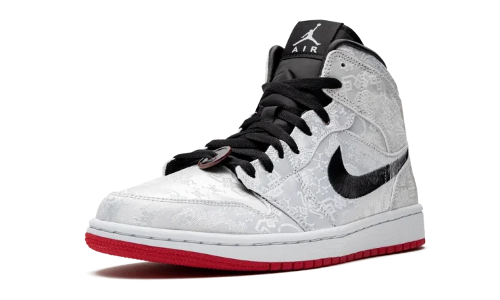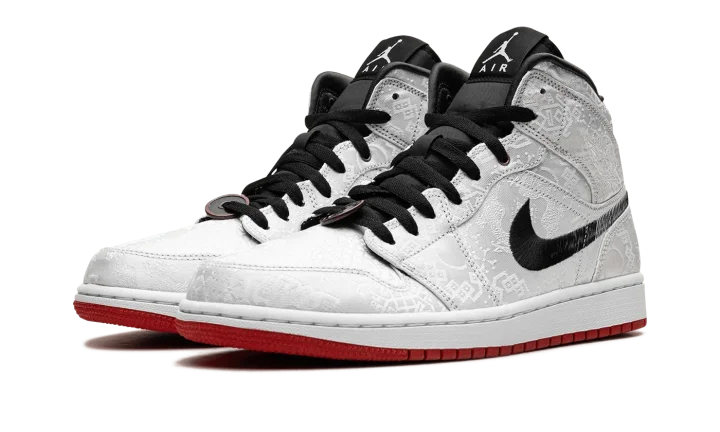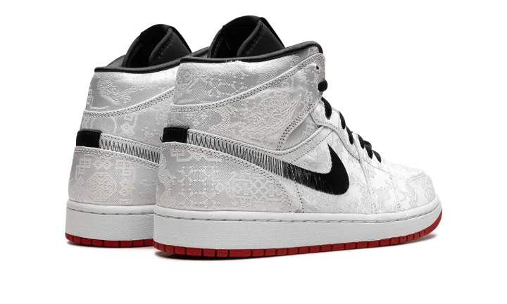 The Edison Chen x Air Jordan 1 Mid "Fearless" is the CLOT designer's reimagining of Michael Jordan's first signature shoe as part of the massive "Fearless" campaign of winter 2019. Inspired by the Chinese concept of yin and yang, CLOT's traditional "Royale Silk" material is applied throughout the upper of the shoe. The repeating pattern is contrasted by a black embroidered Swoosh on the mid-panel and a tonal embroidered Wings logo on the collar. When worn, the silver nylon woven upper reveals an underlying black and gold premium construction. Detailing includes a Swoosh and Chinese coin tied into the black cotton laces, which is located on the throat of the shoe. A white rubber midsole and red outsole with Nike branding finishes off the look. The Edison Chen x Air Jordan 1 Mid "Fearless" was released on December 6, 2019 in limited quantities.