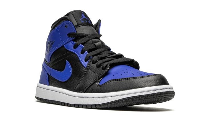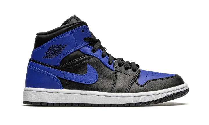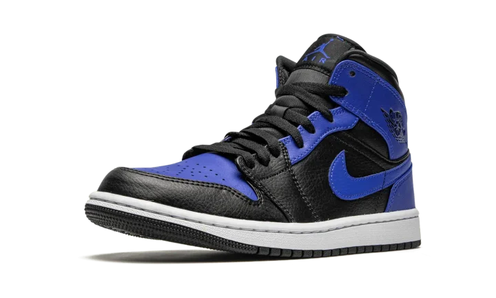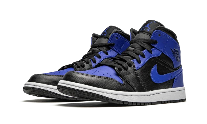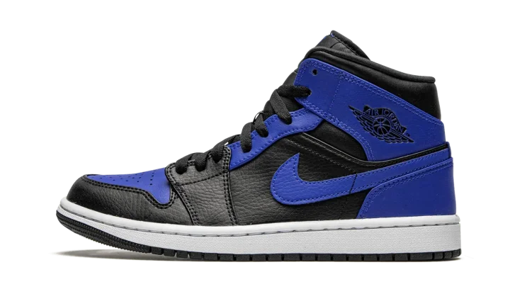 The Air Jordan 1 Mid "Hyper Royal" appears in a similar color block to an original and iconic colorway of Michael Jordan's first signature shoe. The royal and black color combination of the "Hyper Royal" is reminiscent of the look of the Air Jordan 1 High "Royal," one of the most popular Jordan models of all-time. Blue leather detailing can be found on the perforated toe and on the upper eyelets, collar, heel, and Swoosh branding. Black tumbled leather is located on the forefoot, mid-panel, and collar. A "Wings" logo resides on the collar and a Hyper Royal accented Jumpman is printed on the tongue tag. The look is rounded into form by a white rubber midsole and black outsole.