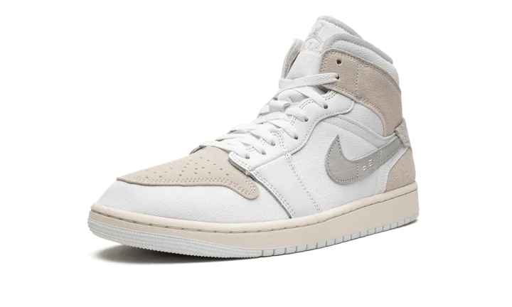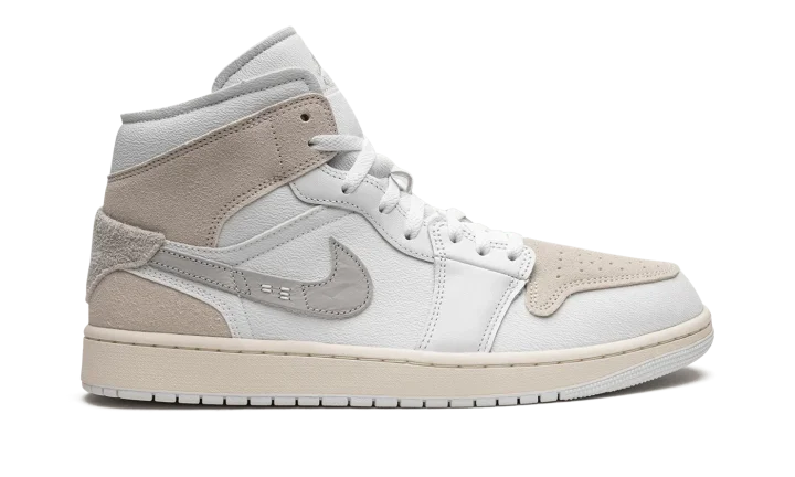 The Air Jordan 1 Mid SE Craft "Tech Grey" is an alternate version of the lifestyle shoe that updates its design with an "inside-out" concept. The "Tech Grey" gives the Jordan 1 Mid Craft a unique appearance with mismatched panels in various textiles. White leather can be found on the mid-panel, toe cap, forefoot, eyelets, and collar. Grey suede appears on the perforated toe, on the collar, and heel. A Tech Grey leather Swoosh is found on the sides. An overlay panel with "Wings" branding is located on the back of the shoe, moved from its placement on the collar on the Air Jordan 1 Mid's original design. Release date: April 11, 2023