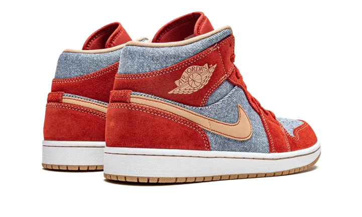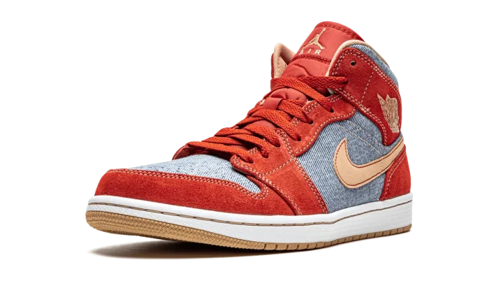 The Air Jordan 1 Mid SE "Denim/Red Suede" combines multiple materials onto the retro basketball shoe by Jordan Brand. The Air Jordan 1 Mid has proven to be a creative canvas over the years and the "Denim/Red Suede" is another instance of the shoe's versatility. Cinnabar suede overlays on the toe cap, forefoot, eyelets, collar, and heel provide an attention-grabbing look. The perforated toe, mid-panel, and collar are constructed from a light wash denim fabric. A tan leather Swoosh with red contrast stitching appears on the mid-panel and a tan "Wings" logo is found on the collar. Jordan Brand embroidered a beige Jumpman and "Air" logo to the top of the red nylon tongue to complete the look.