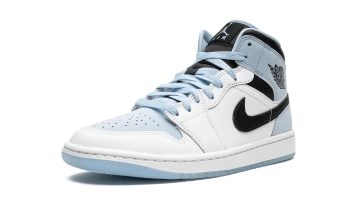 The Air Jordan 1 Mid SE "Ice Blue" is a colorway of the lifestyle shoe that calls to mind the popular "UNC" theme. Originally appearing on the Jordan 1 in 1985, the "UNC" color story, inspired by Michael Jordan's alma mater, has since been featured on many other Jordan shoes, and it seems to loosely inspire this Jordan 1 Mid "Ice Blue" colorway. The upper features an Ice Blue leather perforated toe and white leather mid-panel, toe cap, forefoot, and eyelet overlay. A black leather Swoosh appears on either side of the shoe. Black "Wings" branding is found on the collar and Ice Blue Jumpman detailing is found on the tongue. Underfoot, a white rubber midsole and Ice Blue outsole complete the look. Release date: March 1, 2023