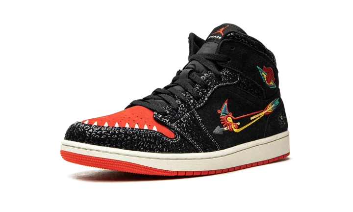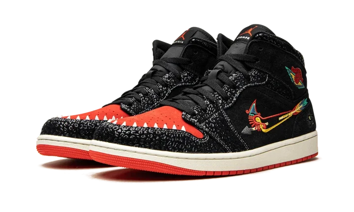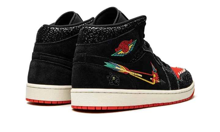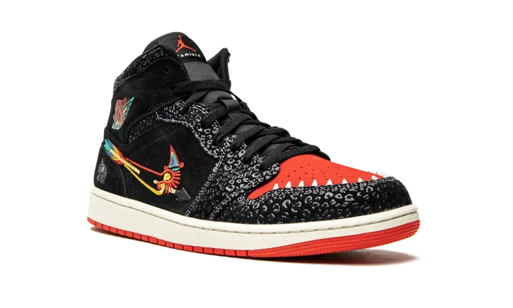 The Air Jordan 1 Mid SE "Siempre Familia" is a special edition of the classic basketball shoe released as part of Nike's "Dia de los Muertos" collection honoring the traditional Mexican holiday. A creative look for the Air Jordan 1 Mid, the "Siempre Familia" is a colorway inspired by Mictlán, the underworld of Aztec mythology that spans nine levels. Details include animal-inspired graphics and prints that reference those that usher one into the afterlife. The upper features a predominantly black appearance with unique details such as textured overlays and a modified bow-and-arrow-style Swoosh. The "Wings" logo is designed in a multicolor look inspired by "Dia de los Muertos." Jaguar-inspired teeth border the red perforated toe box. Release date: October 29, 2021