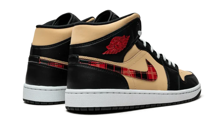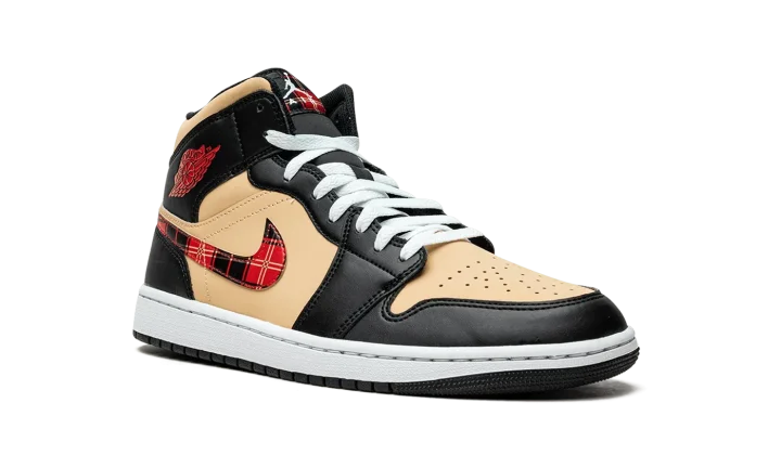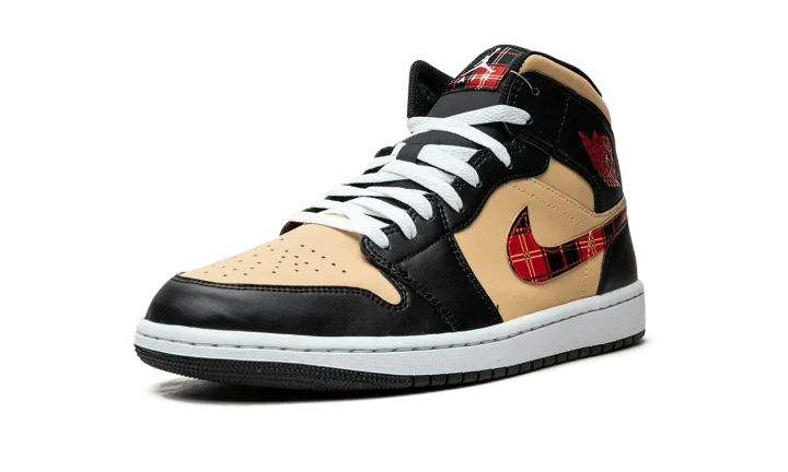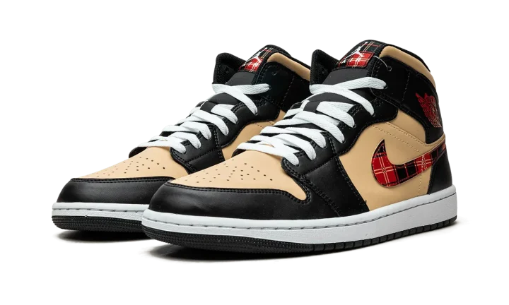 The Air Jordan 1 Mid "Tartan Swoosh" is a unique colorway of the popular lifestyle shoe with a tartan plaid Swoosh. Like its name suggests, the "Tartan Swoosh" updates the Jordan 1 Mid with a plaid Swoosh that gives the shoe a decidedly casual look. The upper features a Sesame-colored leather base with black leather overlays. A red "Wings" logo appears on the collar and a white Jumpman logo is found on the tartan tongue tag. The white rubber midsole is paired with a black outsole.
