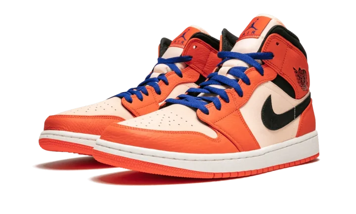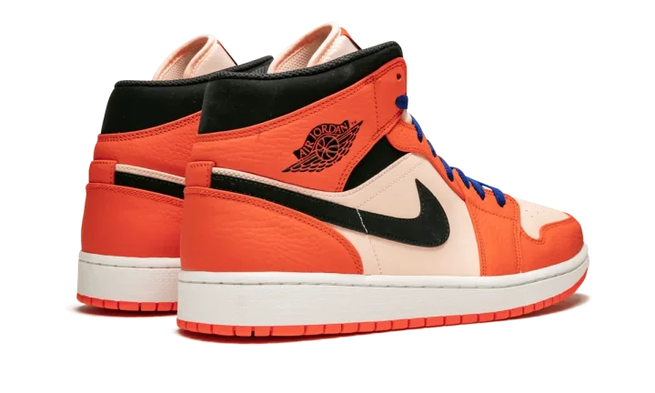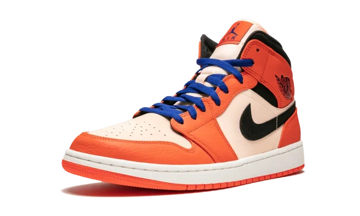 Orange Air Jordan 1 Mid SE team orange from jordan featuring a contrasting blue front lace-up fastening, perforations at the toes, a contrast black Swoosh applique to the side walls and a black Air Jordan motif to the side of the heel.