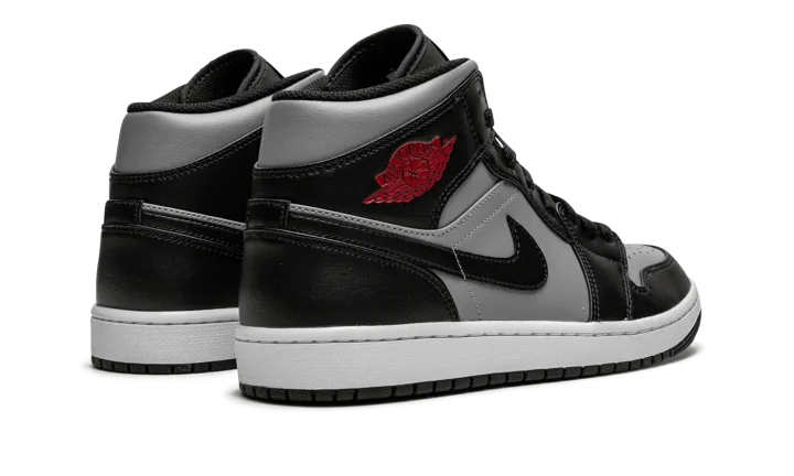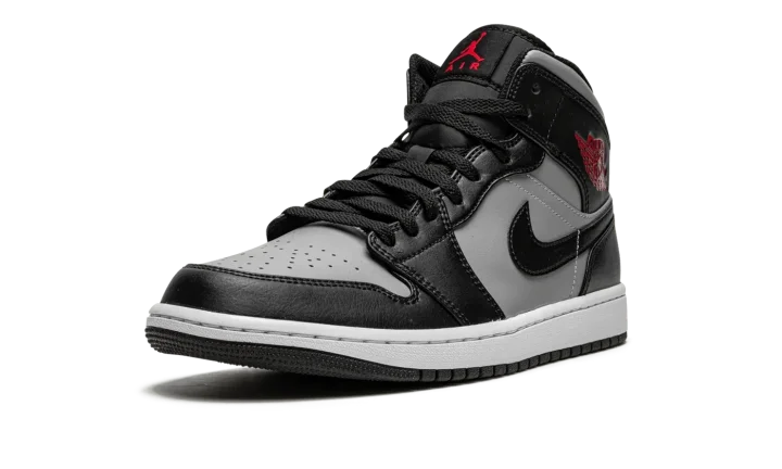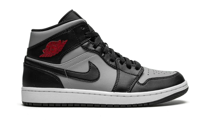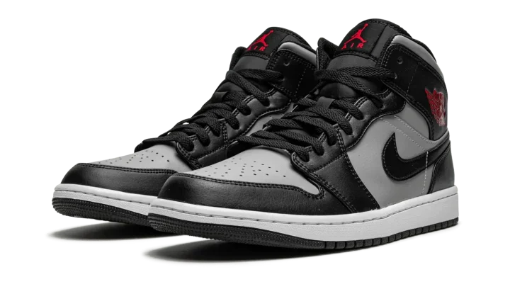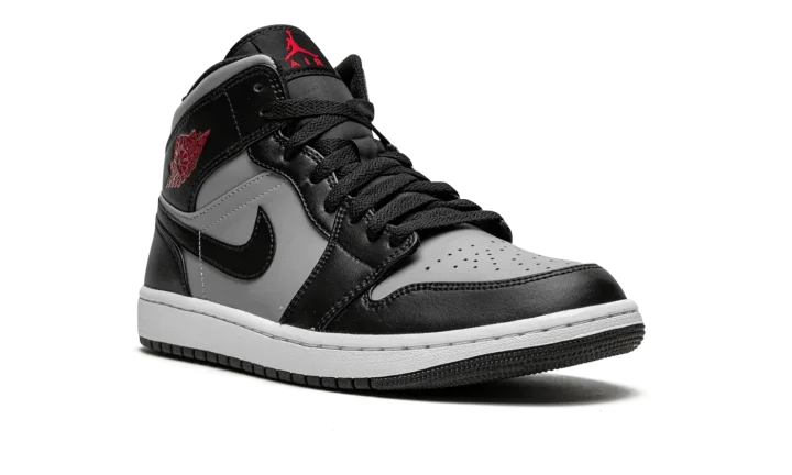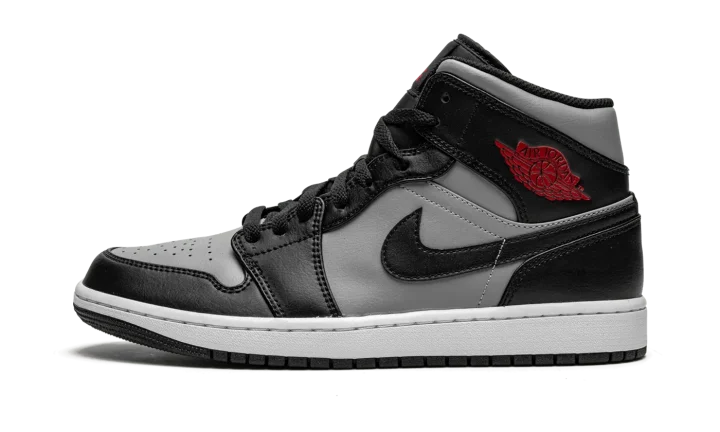 The Air Jordan 1 Mid "Shadow/Red" is a mostly two-tone, grey-and-black colorway of Michael Jordan's first signature shoe in the mid-top silhouette that draws inspiration from the shoe's original "Shadow" design. The "Shadow/Red" is a clean, versatile look for the popular mid-top Air Jordan 1 that features Particle Grey leather on the perforated toe, mid-panel, collar, and heel. Contrasting black leather appears on the overlays and Swoosh branding. The two-tone appearance is similar, but not a direct one-to-one, of the Air Jordan 1's original "Shadow" colorway. A Gym Red "Wings" logo can be found on the collar and a red Jumpman with "Air" detailing appears on the black nylon tongue tag. A black nylon tongue, white rubber midsole, and black outsole complete the look.