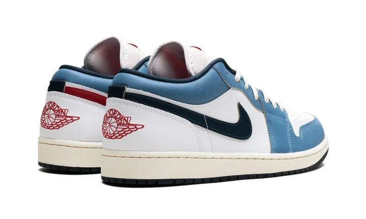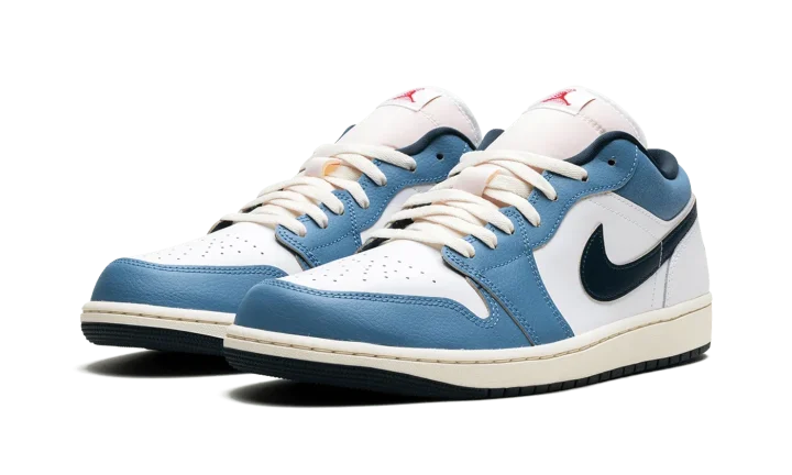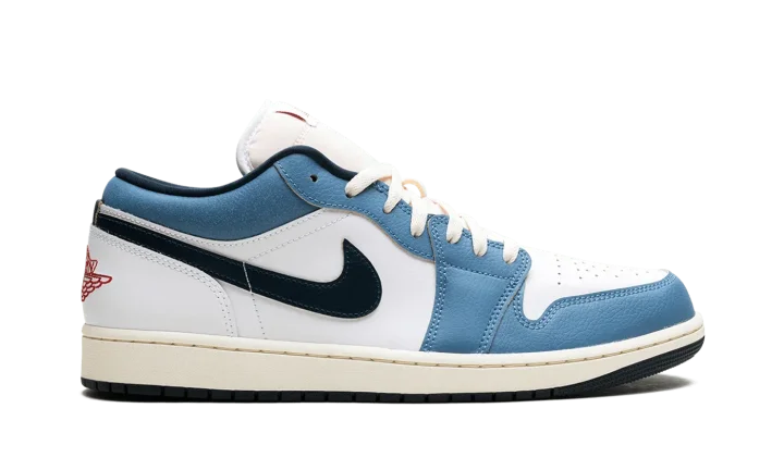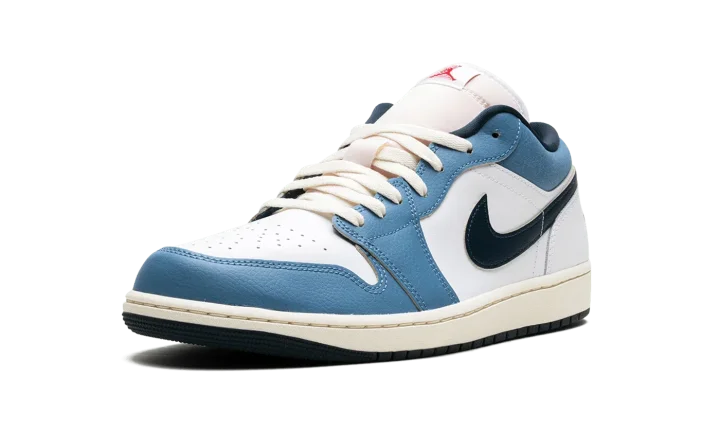 The Air Jordan 1 Low "Motion" is a colorway of the retro basketball shoe inspired by its iconic branding. The "Motion" Jordan 1 Low refers to the Air Jordan 1's signature Jumpman logo on the tongue, and how it appears to be flying through the air en route to a slam dunk. The upper features a White leather construction with Aegean Storm leather overlays on the toe, forefoot, and eyelets. The Swoosh branding on the sides swap between Armory Navy and red on the lateral and medial sides, respectively. A red "Wings" logo is embroidered on the heel, while a motion Jumpman logo can be found on the tongue. A Pale Ivory midsole completes the look. Release date: June 14, 2024