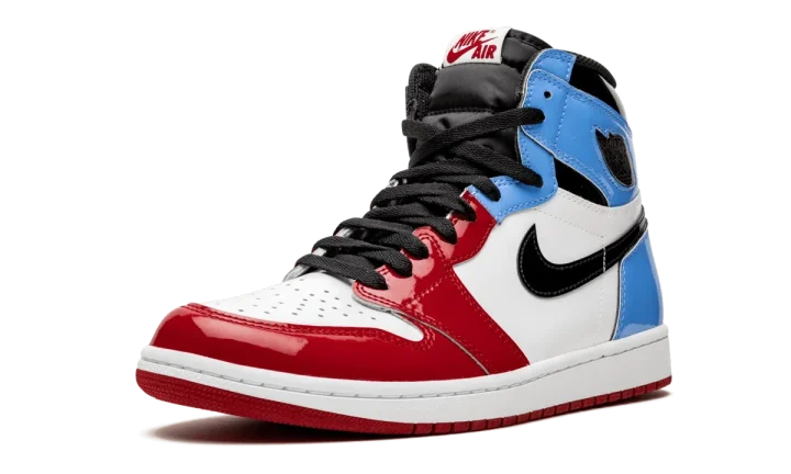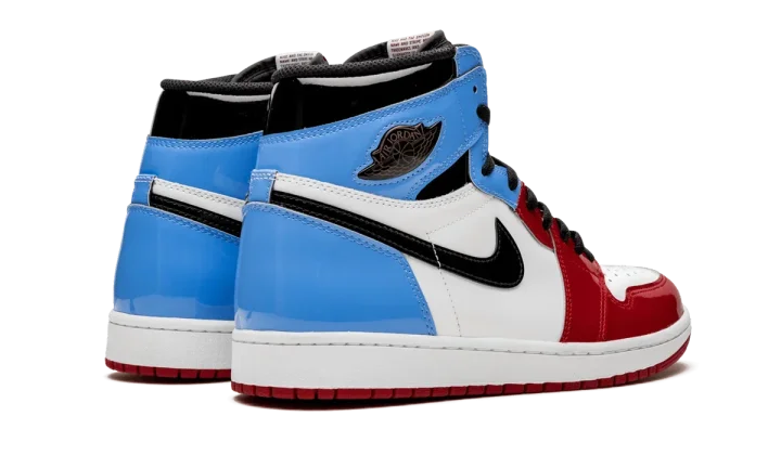 The Air Jordan 1 "Fearless" colorway celebrates the tenth anniversary of Michael Jordan's basketball Hall of Fame induction speech in 2009. Dressed in premium patent leather on its upper, the shoe combines the beloved "UNC" and Chicago Bulls colors in a split fashion. The fusion colorway features a white patent leather base on the mid-panel with a white perforated toe. Red overlays appear on the forefoot and toe cap with Carolina blue patent leather spanning the ankle and heel. Contrasting the look is a glossy black patent leather Swoosh on the mid-panel with a black Air Jordan wings logo with gold accenting sitting on the collar. Unique to this design, a graphic that says "Limits, like fear, are often just an illusion," with a line through the bold word "FEAR," appears on the insoles. Completing the look of the Jordan 1 "Fear" is a white rubber midsole with a bold red outsole. Release date: November 2nd, 2019.