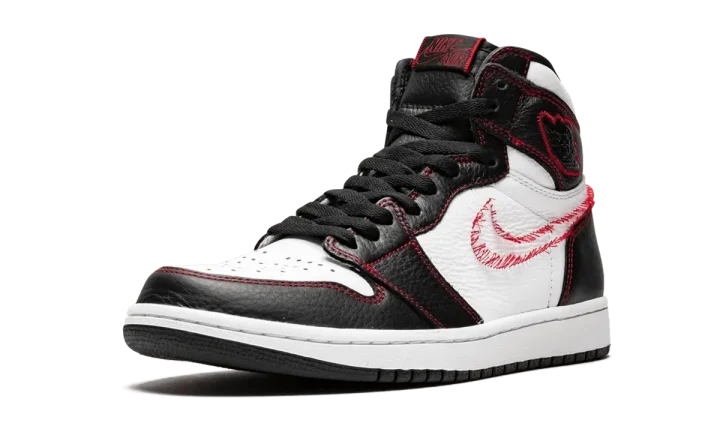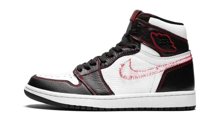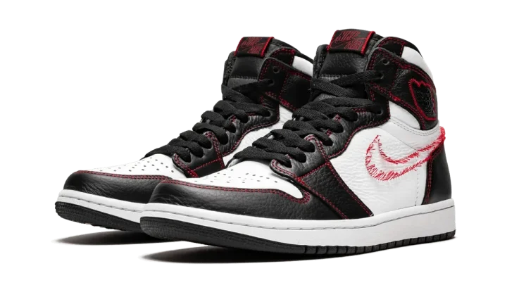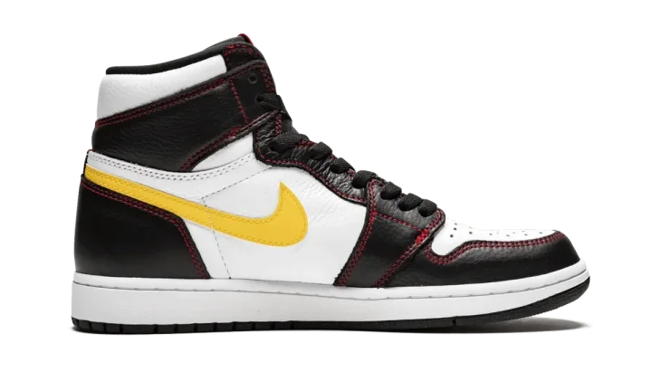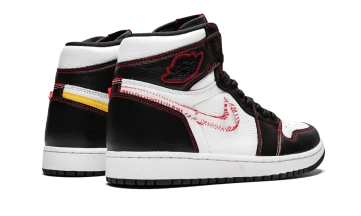 The Air Jordan 1 High "Defiant" is a unique colorway of the iconic model featuring "unstitched" Swooshes on the lateral sides. The eye-catching construction features a black and white leather upper with red contrast stitching throughout, including for the deconstructed stitching that makes the shape of the Swoosh, intended to appear as if the leather Swoosh was cut off. Intact yellow leather Swooshes are found on each medial side. A black leather tongue and Air Jordan "wings" logo patches complete the distinct colorway. The Air Jordan 1 High "Defiant" with unstitched Swooshes released in July 2019.