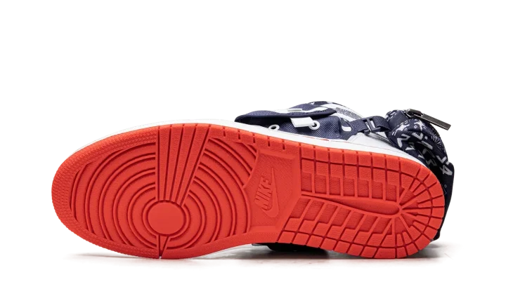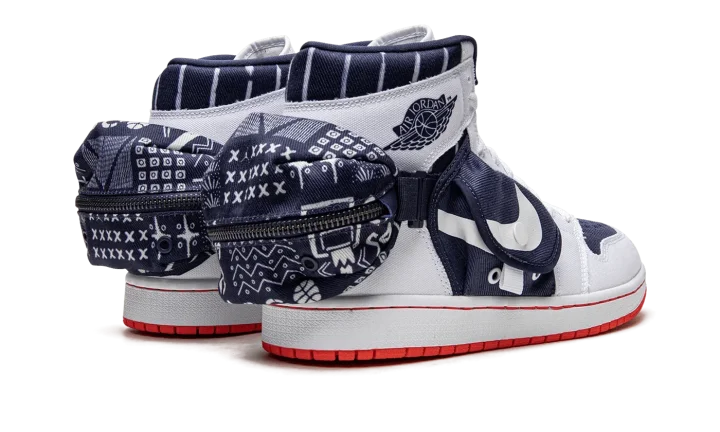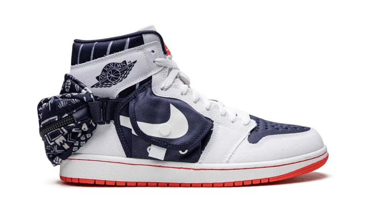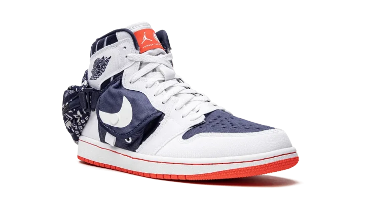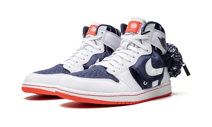The Air Jordan 1 High Utility "Quai 54" is the modified version of the retro basketball shoe in a colorway that honors the Parisian streetball tournament. The Jordan 1 High Utility progresses Michael Jordan's first signature shoe with multiple storage pockets, including a stash pocket on the mid-panel and on the heel. On this "Quai 54" colorway, the shoe is designed with a navy textile base with white canvas overlays. A snap-button stash pouch appears on both sides. A third pocket with a zip closure is found on the back of the shoe. Dual "Quai 54" and Jumpman branding appear on the orange nylon tongue tag. Underfoot, a white rubber midsole and orange sole complete the look. Release date: August 30, 2022