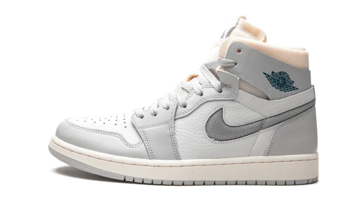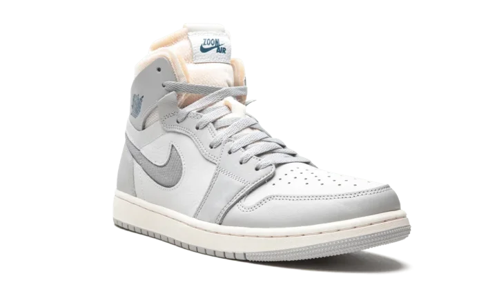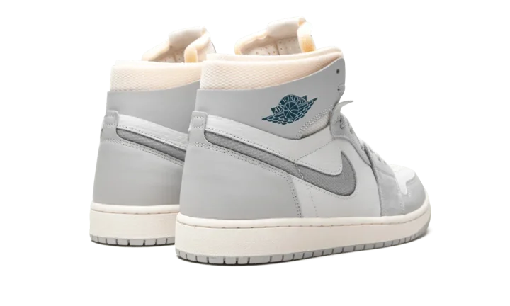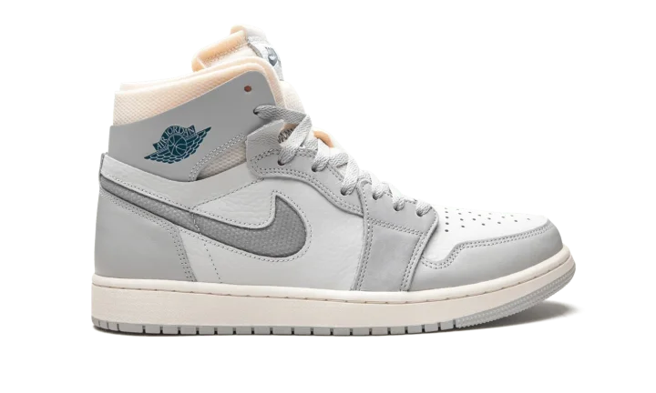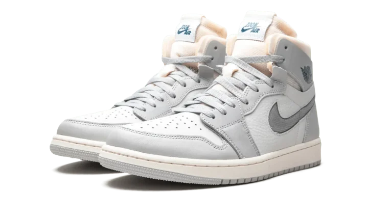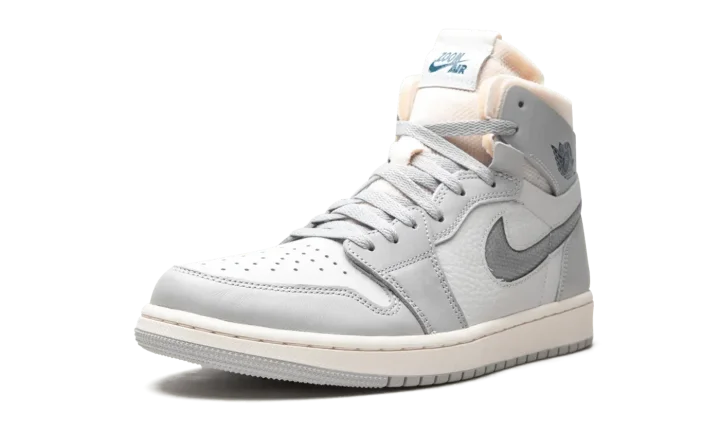 The Air Jordan 1 Zoom CMFT "London" is a steely colorway of Michael Jordan's first signature shoe that was released exclusively in the United Kingdom. The Jordan 1 Zoom CMFT is an alternate version of the iconic high-top retro basketball shoe with upgraded Zoom Air technology embedded in its midsole. Other modifications such as exposed foam padding on the tongue and mesh on the collar differentiate the model from its Jordan 1 relatives. As for the design of the "London," the color block is influenced by the city's moody, grey, overcast weather. Light Smoke Grey leather overlays appear on the forefoot, eyelets, collar, and heel. White tumbled leather forms the base. A dotted grey tumbled leather Swoosh can be found on either side and a blue "Wings" logo is located on the collar. A "Zoom Air" insignia is printed on the patch stitched onto the light pink mesh tongue, replacing the standard "Air" detailing found on the original Jordan 1 model. As previously mentioned, Zoom Air technology is encased within the vintage inspired cream midsole for all-day comfort. The Air Jordan 1 Zoom CMFT "London" was released exclusively in the United Kingdom in 2021.