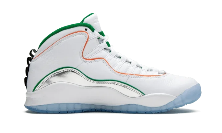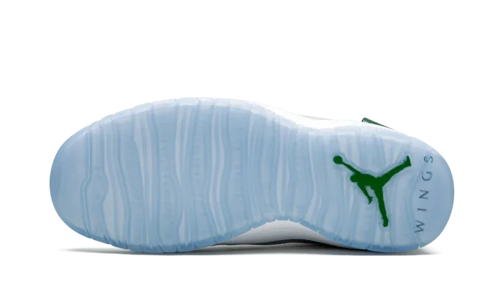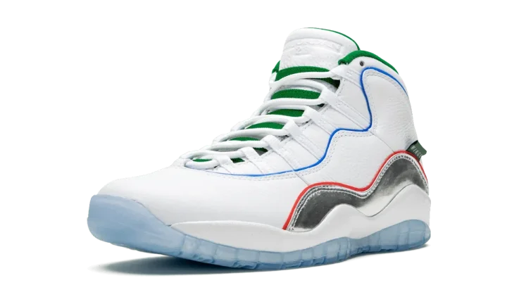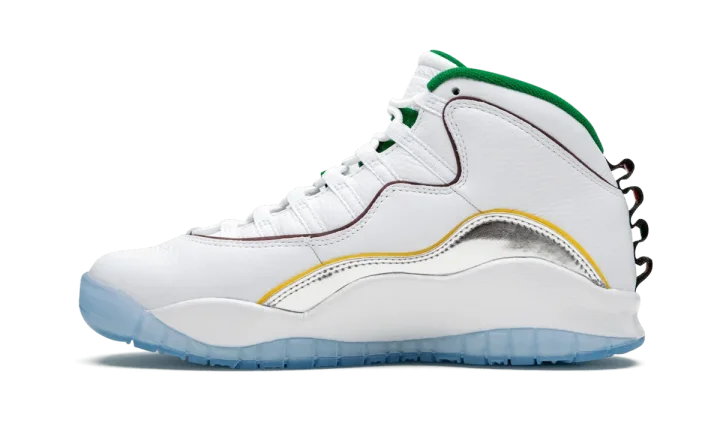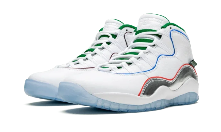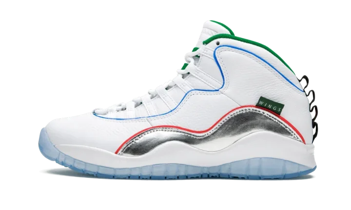 The Air Jordan 10 "Wings" is a special colorway that was released during the NBA All-Star Weekend 2020 festivities. The model was included as part of Jordan Brand's 8x8 Collection which recruited four students in the greater Chicago area to lend their creative talents to some of the most iconic Air Jordans of all time. The upper features soft white leather across the toe, collar, and heel. Taking on a mismatching aesthetic, both shoes feature different colors for the added piping. A flashy silver metallic mudguard adds the cheery vibe of the shoe. Additional design elements include a mini "Wings" tab on the mudguard, a green liner, and a black nylon piece on the heel with dots in the eight colors of Chicago's transit line. The Air Jordan 10 "Wings" was released on February 15, 2020.