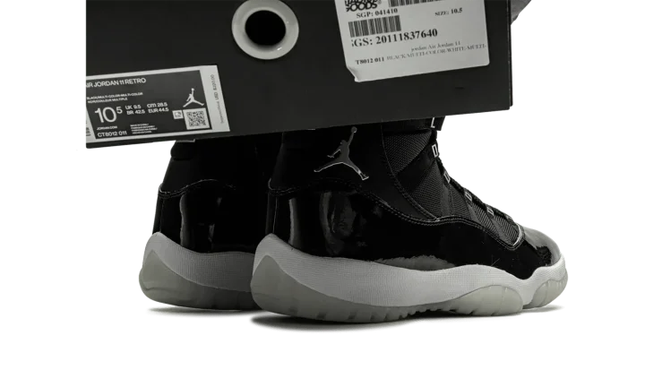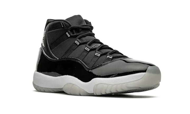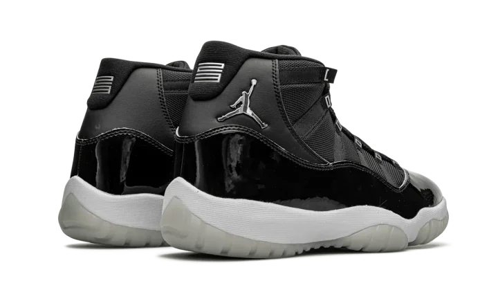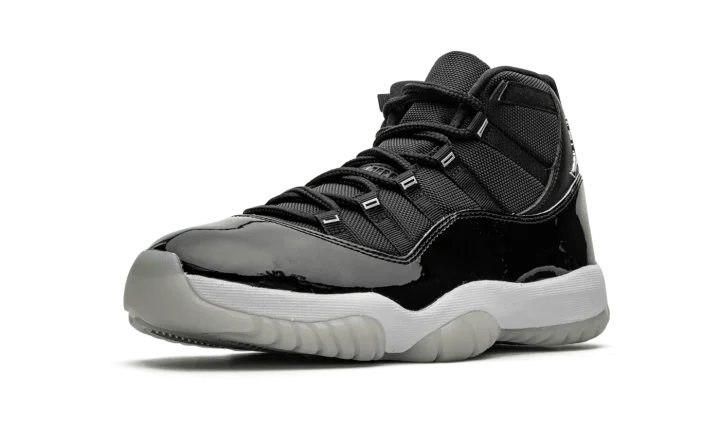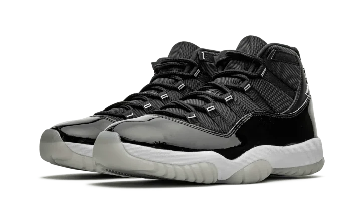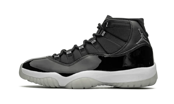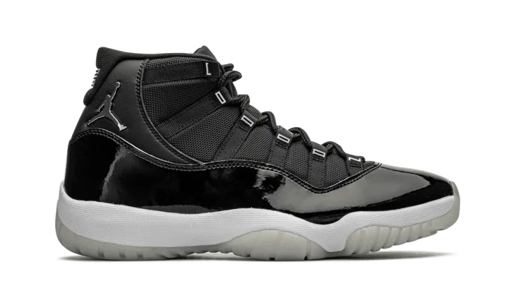 The Air Jordan 11 "Jubilee" honors the 25-year anniversary of Michael Jordan's eleventh signature shoe by bringing to life an original design concept sketched by Tinker Hatfield in the '90s. The "Jubilee" borrows from the "Concord" and "Space Jam" colorways in that it features a predominately black and white appearance. The word "Jordan" is spelled out in Metallic Silver text along the side of the eyelets in reference to the original sketch of the shoe by Hatfield. A silver Jumpman emblem appears in the same premium finish on the collar. Black patent leather above the white midsole is a call back to the styling of the "Concord," "Space Jam," and "Bred" colorways. Release date: December 12, 2020.