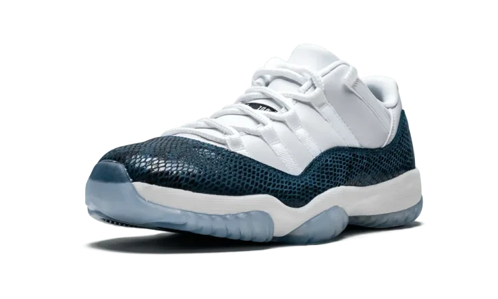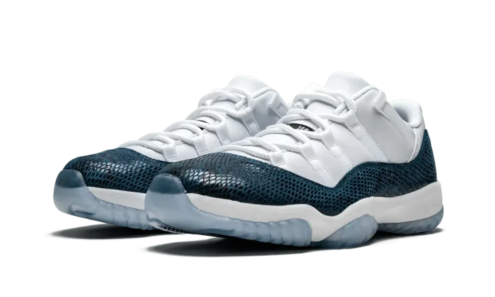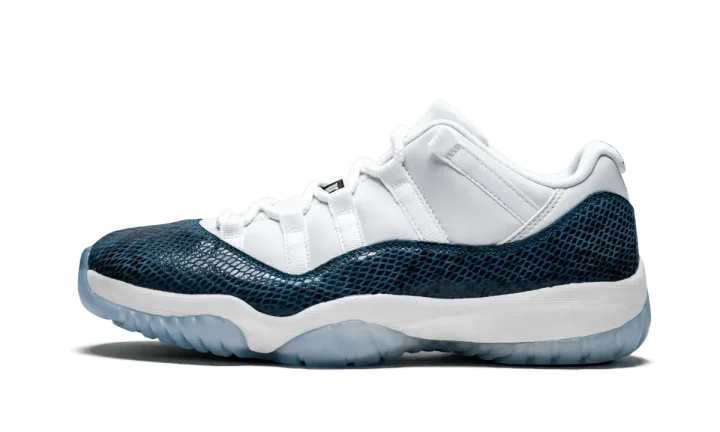The Air Jordan 11 Low "Blue Snakeskin" is the 2019 retro of the snakeskin-patterned low-top Jordan 11. Originally released in 2001 as one of the first Air Jordan 11 Low colorways ever, the classic look returned in the summer of 2019. This edition replicates the original release exactly, with a white leather upper and faux snakeskin mudguard in a dark blue shade. The color scheme is completed with the Air Jordan 11's classic icy clear outsole and black-grey carbon fiber shank. The Air Jordan 11 Low "Blue Snakeskin" released on April 19, 2019.